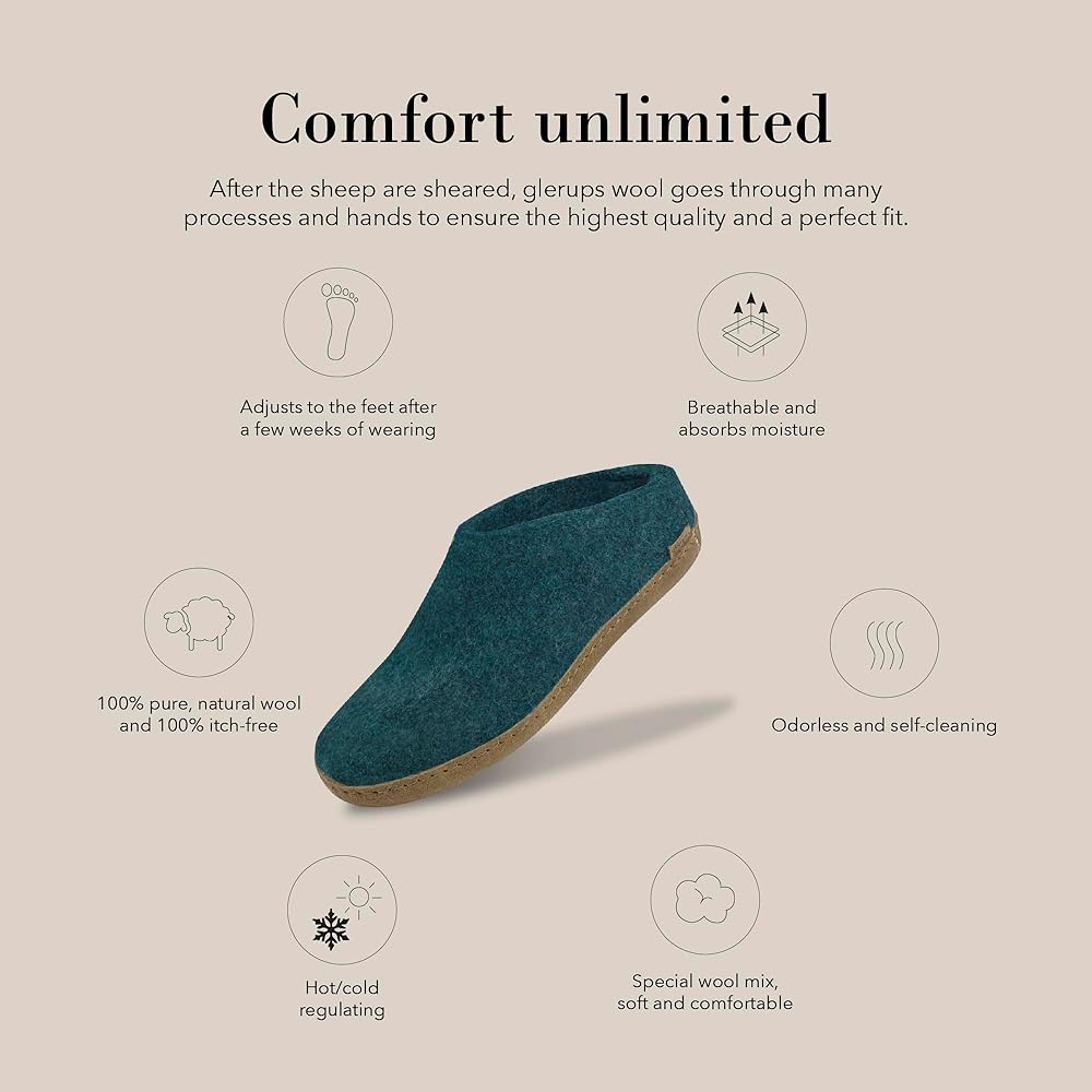 • 100% Pure Natural Wool: glerups slippers for men and women feature 100% pure, natural felted wool uppers that stay flexible and keep feet warm and dry, as wool has a great capacity for absorbing moisture