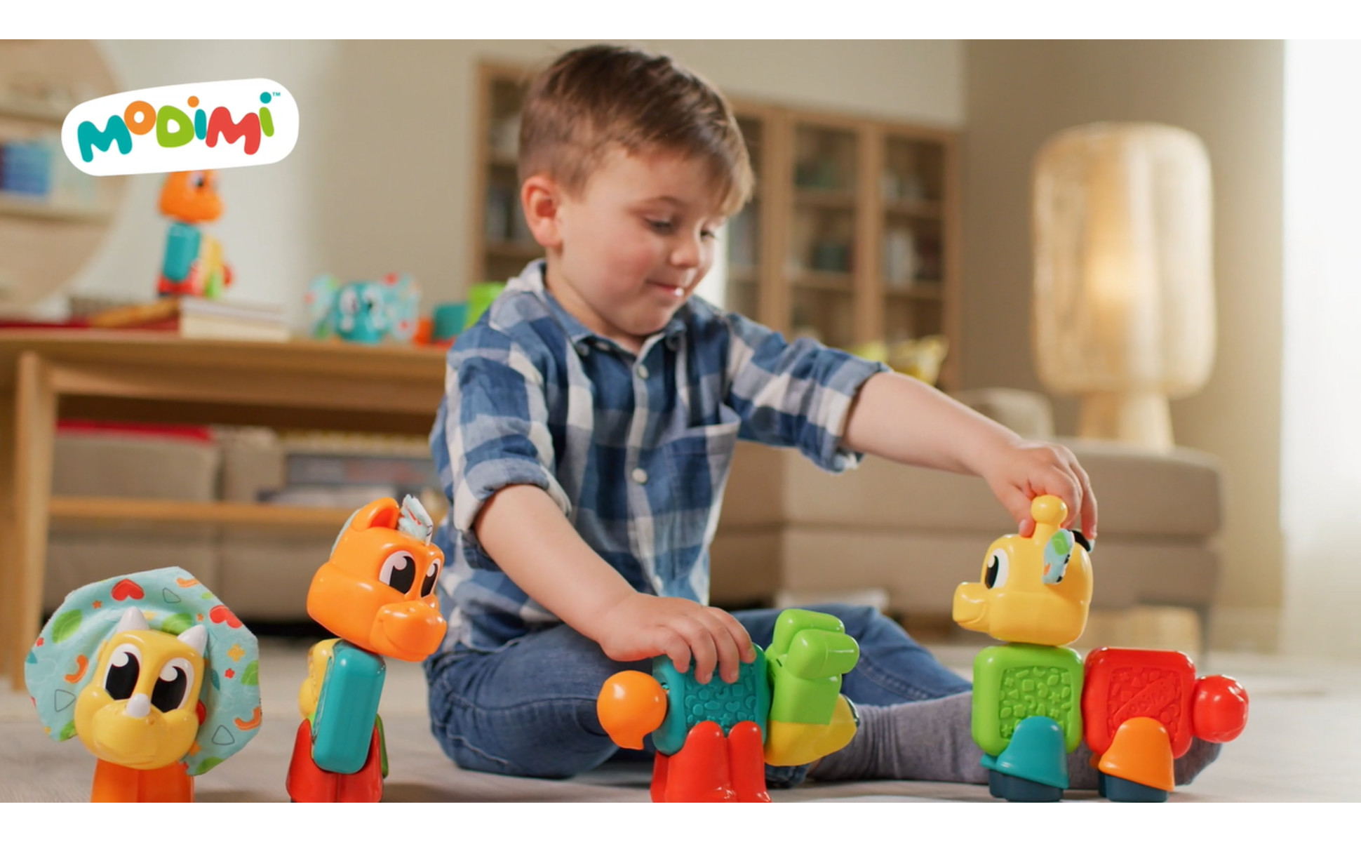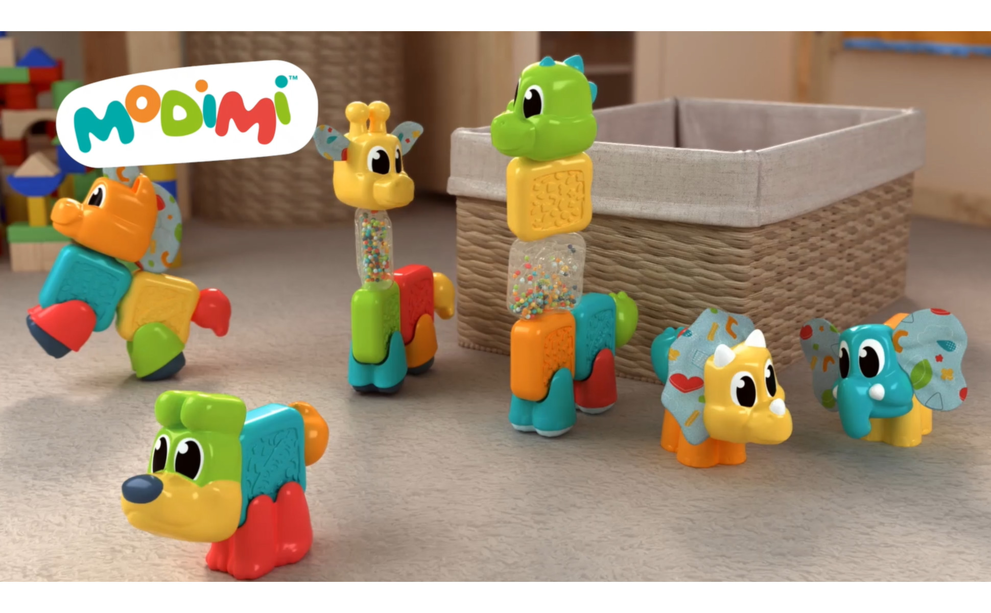 Say hi to Ginny the Giraffe, part of the Modimi range from Goliath, the sensory, modular play system that grows with your child. Ginny is easy for little hands to handle. Chunky pieces fit together different ways. She has soft crinkly ears, interesting textured surfaces, some you can rattle and see right through! Start your collection today and discover how all the durable components in the range connect, so kids can go on creating their own colorful, lovable characters. Based on the Montessori principle that focuses on the most natural way children develop, Modimi helps improve fine motor skills, hand strength and color recognition. They can enjoy role play, building and creating as they grow from infant to toddler, discovering new ways to have fun from 3 months to 3 years and beyond. Modimi is eco-friendly and made from at least 94% recycled plastic, together with sustainable and innovative packaging that has a play value all of its own. Includes 1 Giraffe Head, 1 Shapes Body Block, 1 Rattle Body Block, 1 Fabric Body Block, 2 Sets of Squeaker Feet, and 1 Tail. Recommended for children 3 months old to 3 years.