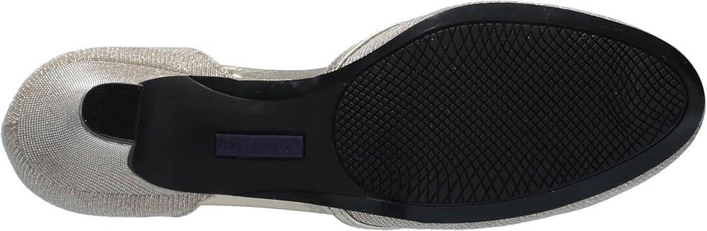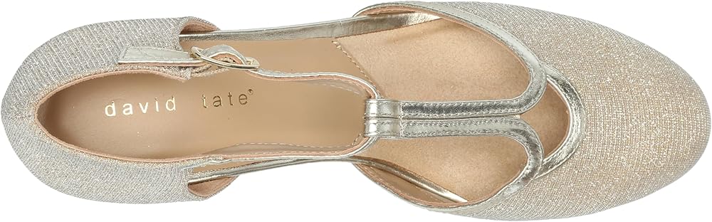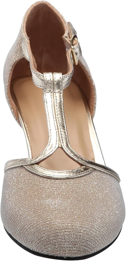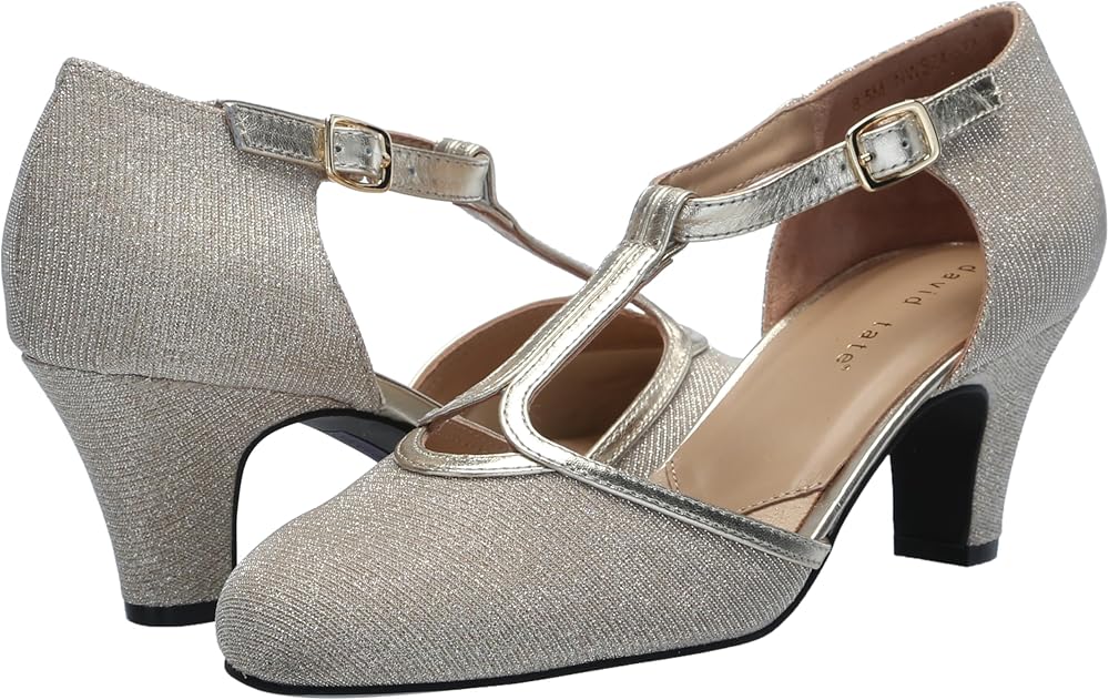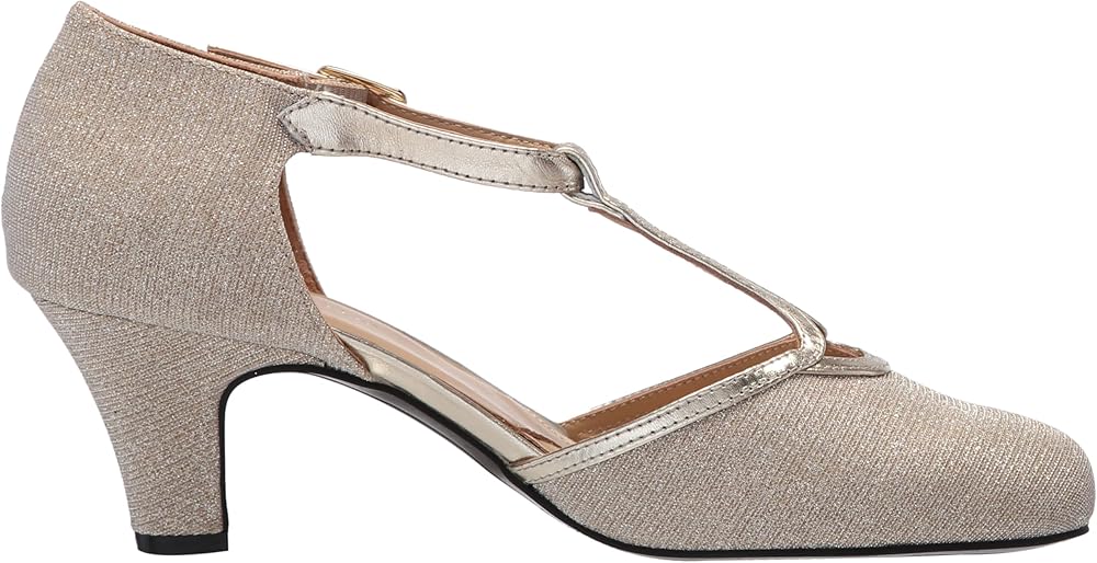– Sensible but great looking evening/special occasion shoe. Updated T-strap treatment with a functional adjustable buckle. Open shank with a deep counter pocket. Glitter fabric upper and a two piece foam padded insole covering with a suede forepart to keep the foot from sliding. Shaped 2 inch heel matching the upper. Skid resistant rubber outsole.t rubber outsole.