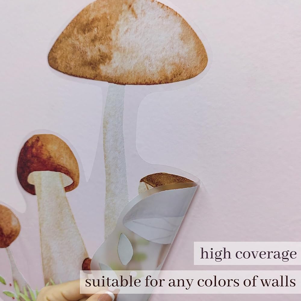 Watercolor Large Mushroom Wall Decals Peel and Stick, Transparent PVC Woodland Animal Wall Stickers for Girls Bedroom Playroom Kids Room, Botanical Wall Decal Decor
