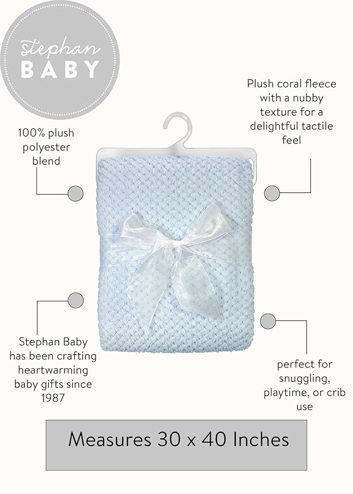 Whether on the floor mesmerized by discovering little fingers and toes or wrapped all snug and cozy for cuddle time, your little one will simply love Stephan Baby's ultra-soft popcorn-textured coral fleece blanket. Unlike standard fleece, coral fleece has a cushy, almost spongy quality which is very tactile; one side is short-napped, similar to French terry cloth and the other side is just a bit shaggy. The soft, full-size crib blanket is neatly hemmed all-around and measures 30 x 40 inches, making it ideal for tummy time as well as tucking your little one in at night. Of course, along with giggles and wiggles, babies have been known to be a festival of splurts, splats, drips and drools, so it's a good thing baby's favorite soft and snuggly blanket is machine washable and dryable! Since 1987, Stephan Baby has been dedicated to fine quality, unique and heartwarming gifts that celebrate the magic of baby's first year. The Stephan Baby family invites you to discover their inspired collections of blankets, gift sets, charming apparel and accessories, beautiful keepsakes and oh-so-huggable plush animals, available on Amazon. All Stephan Baby products are CPSIA tested and approved.
