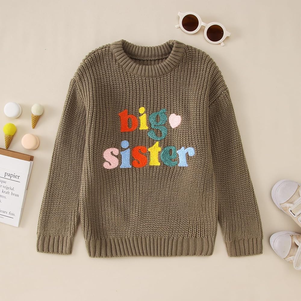 ❄Features: Baby girls crewneck sweaters, big sister embroidered letter printed pullover top, vibrate color, classic round neck, kid long sleeve knitted pullover sweater top, all-matching and stylish. The toddler big sis top is a perfect pregnancy announcement. Good meaningful gift for new big sisters.