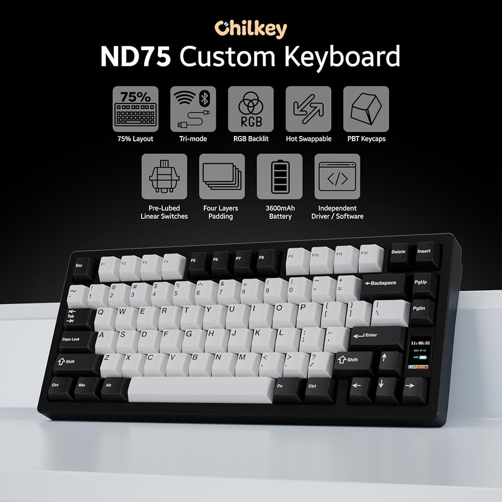 3-Mode Wireless Mechanical Keyboard: ND75 mechanical keyboard with screen has three connection modes: Wired, Bluetooth 5.0, 2.4GHz, easily switch between 3 different wireless devices, no longer limit the connection possibilities. The keyboard is also compatible with Window, MacOS, Linux and Android systems, Support: Independent Driver / Software.