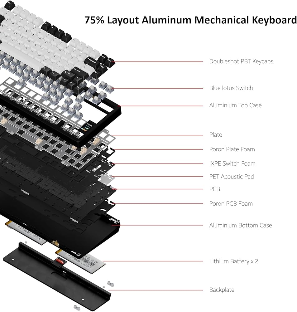 Acoustician with Four Layers of Padding Wireless Keyboard: This 75 percent gaming keyboard has four layers of sound insulation and shock absorption internal design, including Poron plate foam, IXPE switch foam, PET acoustic pad, and Poron PCB foam. These components work in harmony to deliver a Hi-Fi auditory experience with a satisfying sound, delivering focused typing environment.