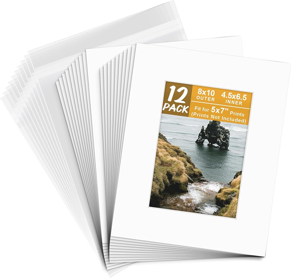 Pack of 12 8x10 WHITE Picture Mats Mattes with White Core Bevel Cut for 5x7 Photo + Backing + Bags