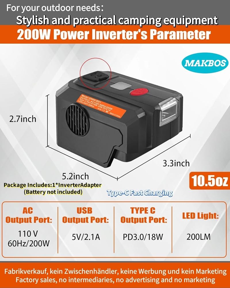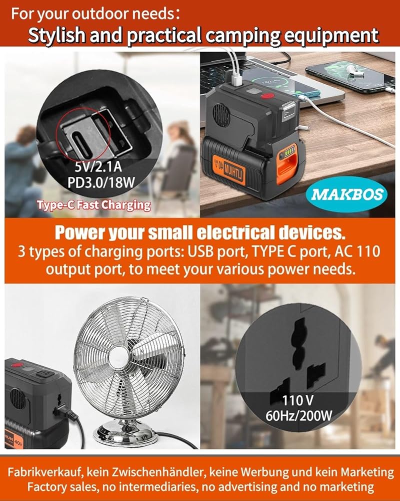 for Black and Decker 40V Battery top Off Inverter Generator,for Black and Decker USB Type-C Fast Charger Adapter with LED WorkingLight,200 Watt Power Inverter,Portable Power Source,40V DC to 110V AC