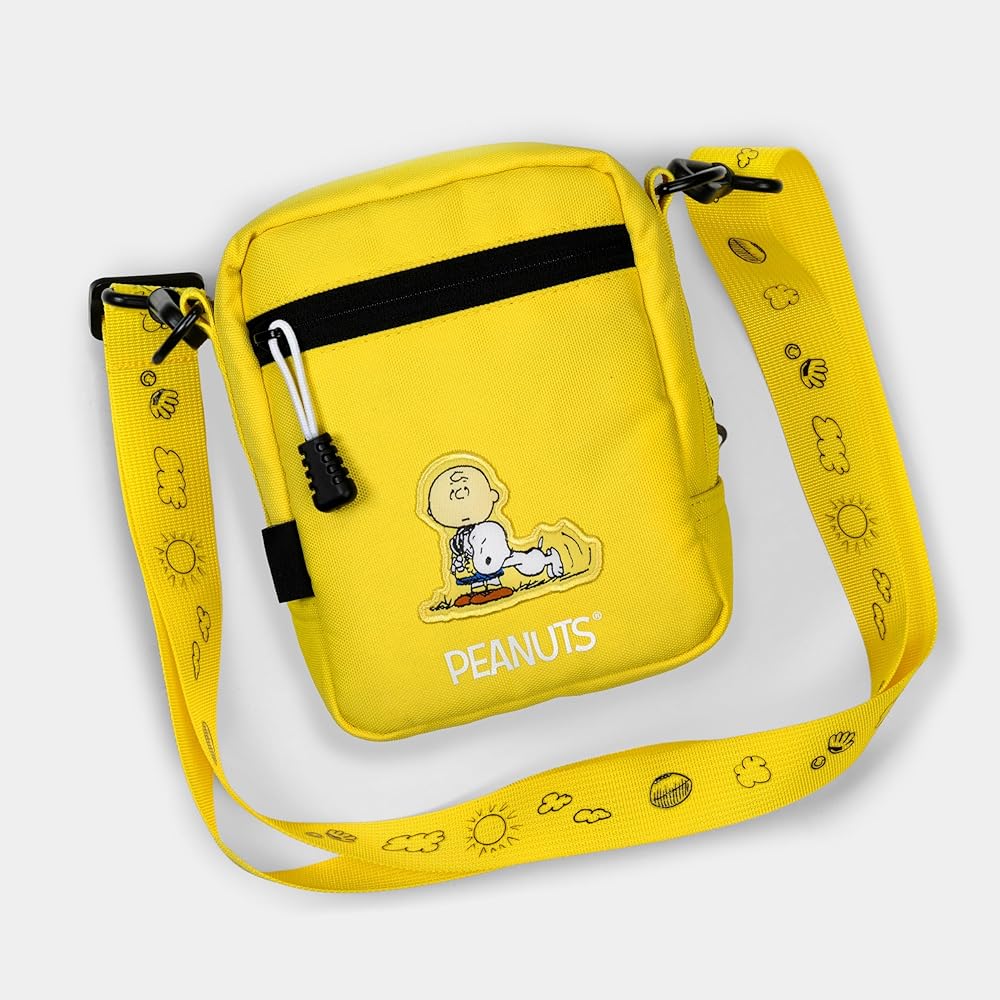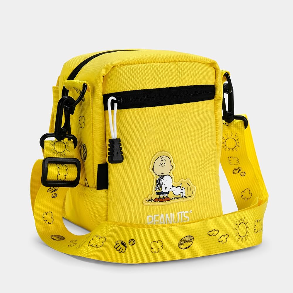 The bag is lined with a bold interior graphic composed of classic Peanuts' comic strips and has an adjustable shoulder strap.
