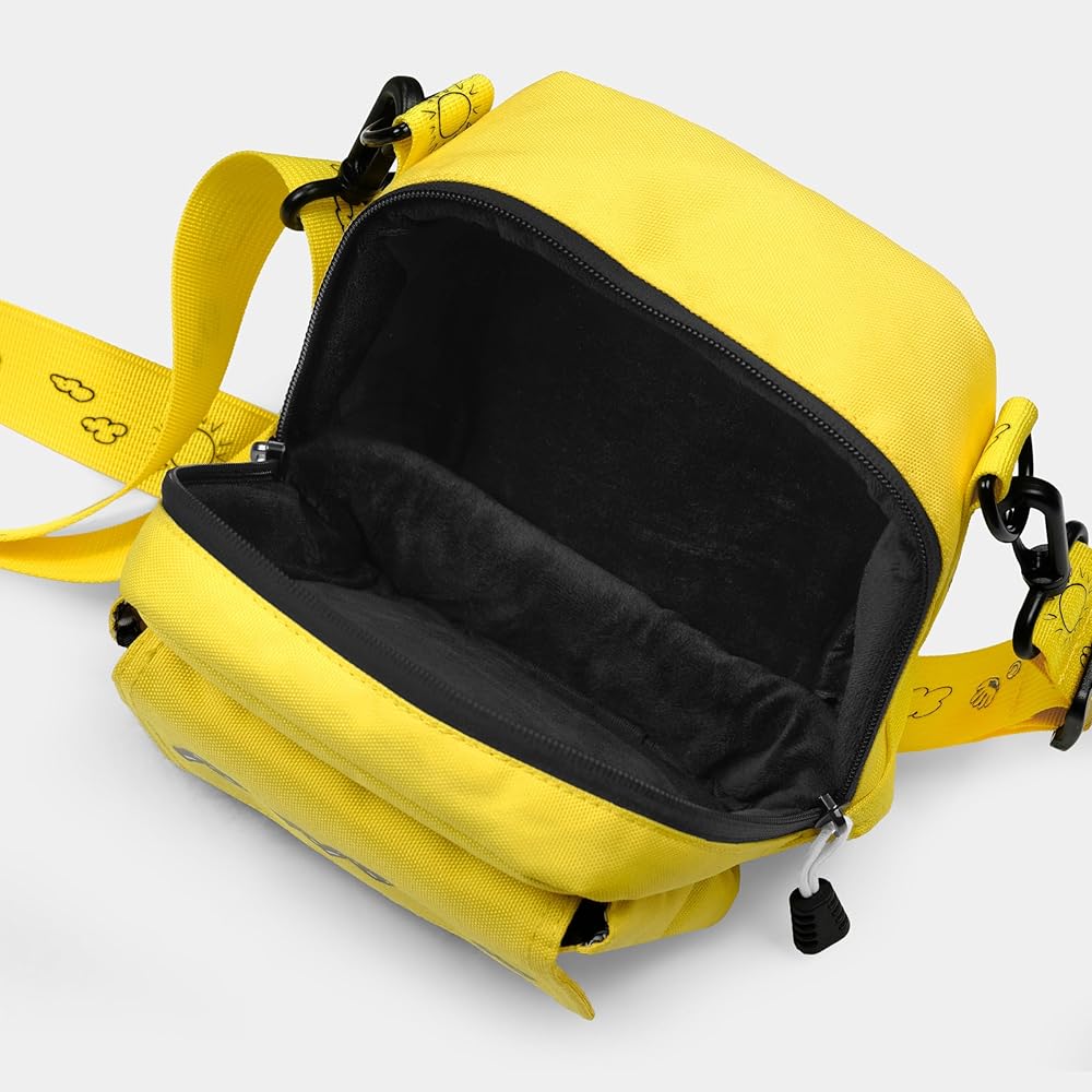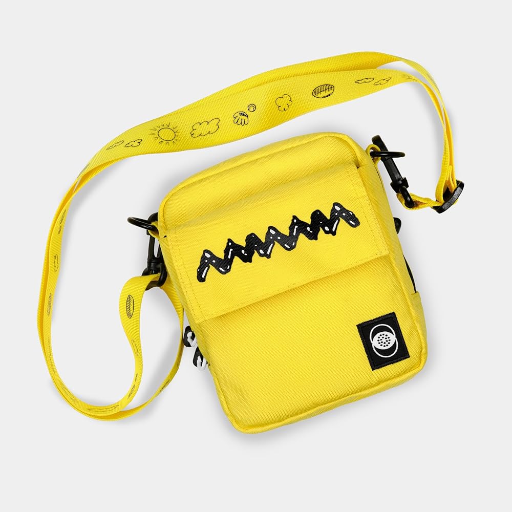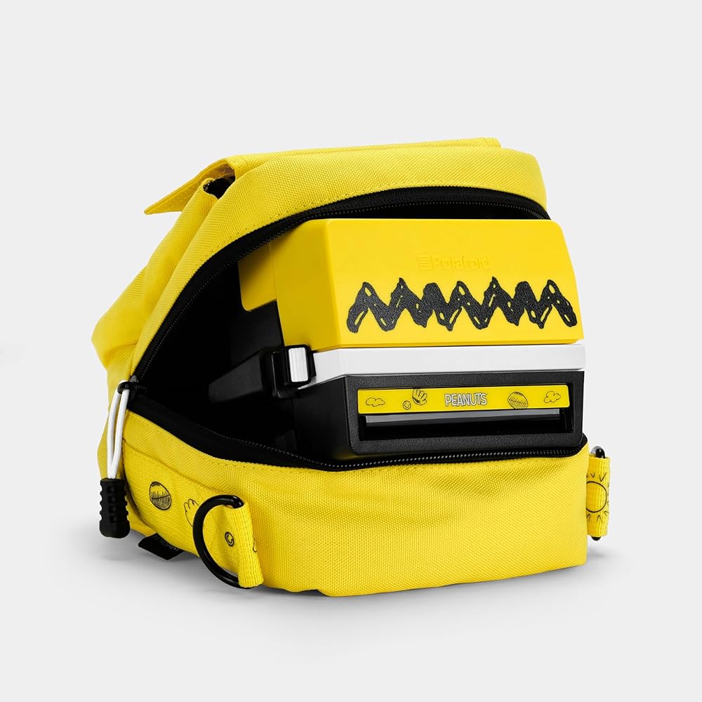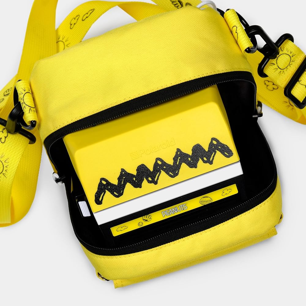 Specially designed to complement the Peanuts Charlie Brown 600 instant film camera, this instant camera bag is flexible enough to accommodate many different types of cameras and film. Built from a durable yellow textile and prominently displaying the classic zig-zag pattern from Chuck's favorite shirt, the case has a large zipper compartment to store a camera and a smaller front compartment perfect for film or other accessories. The bag is lined with a bold interior graphic composed of classic Peanuts' comic strips and has an adjustable shoulder strap. Please note this bag will not fit Express or Impulse models of Polaroid 600 cameras. Features: Lightly-padded camera compartment with zipper closure Adjustable, removable clip-on strap Two D-rings for adjustable wear Front pocket for one film pack Back zipper pocket for phone or Polaroid photos Specs Bag dimensions: 6 x 6.5 x 4.5in (15.2 x 16.5 x 11.4cm) Strap width: 1.25in (3.25cm) Adjustable strap length: 14.5-28.5 in (36.8-72.4cm) 100% polyester Designed in Milwaukee, WI, made in China