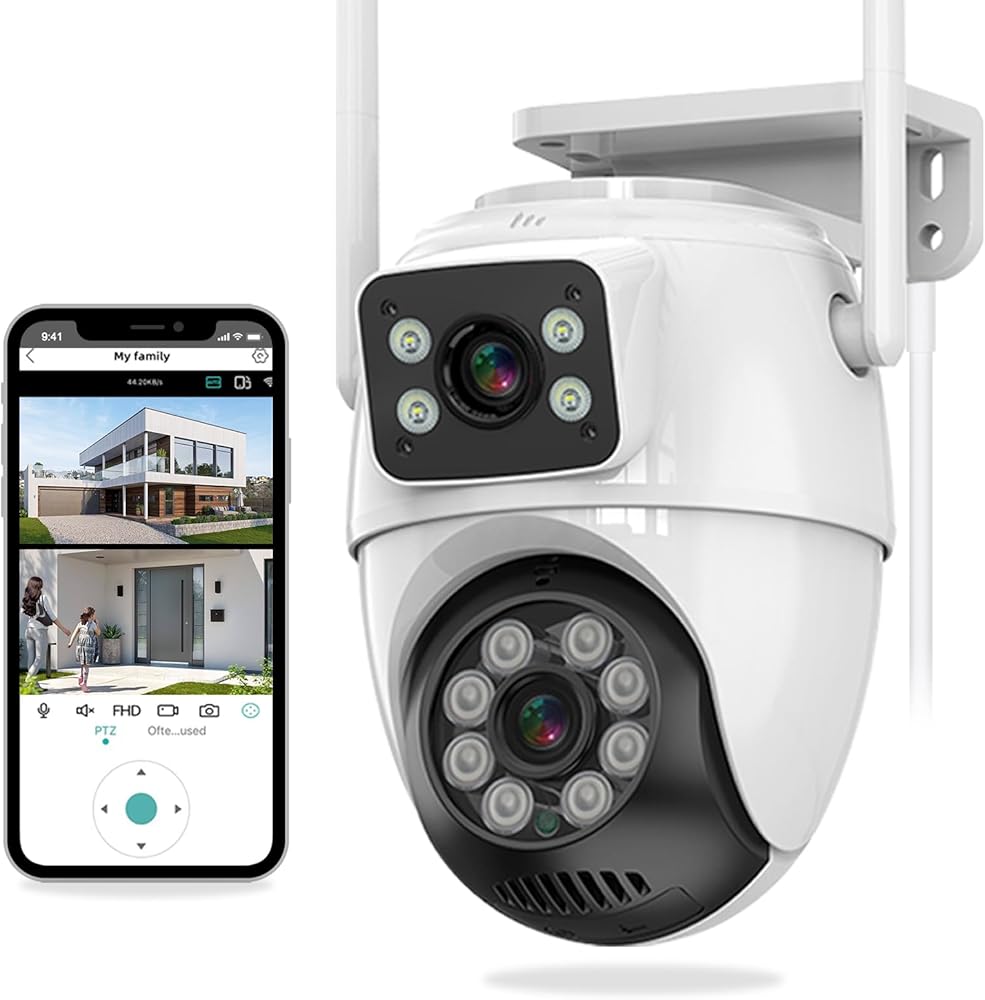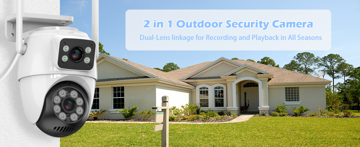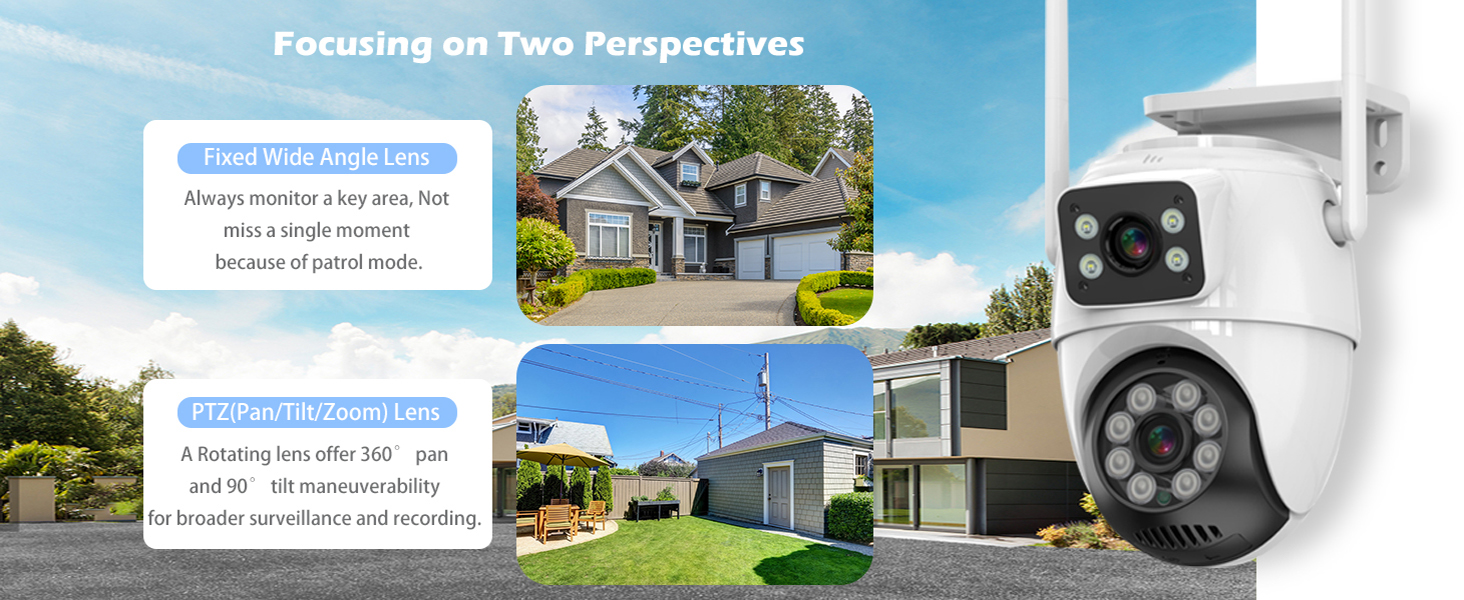 【Pan/Tilt 360°View & 6MP HD Image】GUOANVISION security cameras wireless outdoor has two lens.One fixed bullet outdoor camera monitor the key area, the other PTZ lens can perform positioning cruise of Pan and Tilt 360°. You can swipe up, down, left and right on your phone to rotate and set the point of view of your security cameras wireless outdoor in real-time and get HD pictures and videos.
