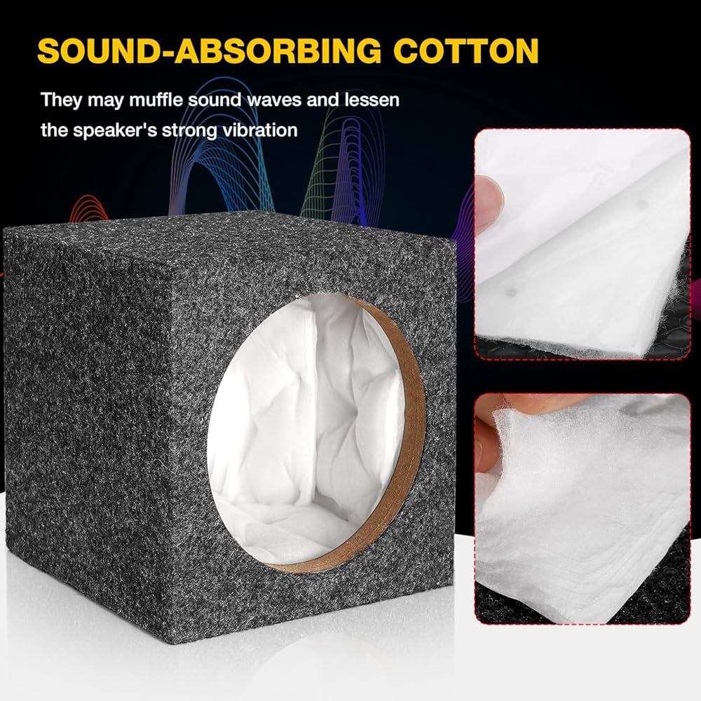 Come with Sound-absorbing Cotton -- Top-quality sound-absorbing cotton dampens sound waves and reduces speaker vibrations, protecting its structure. It comes with adhesive backing for easy, secure placement.