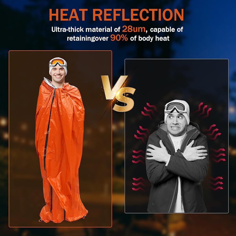 Heat Reflection Up to 90%: The emergency sleeping bags for adults uses Mylar heat reflective material, which can reflect up to 90% of body heat. Studies have shown that 90% of deaths in outdoor emergencies are caused by a sudden drop in body temperature. By using Guijinga's Bivvy Sack, the risk of hypothermia can be significantly reduced, ensuring that you stay warm and safe in harsh environments.