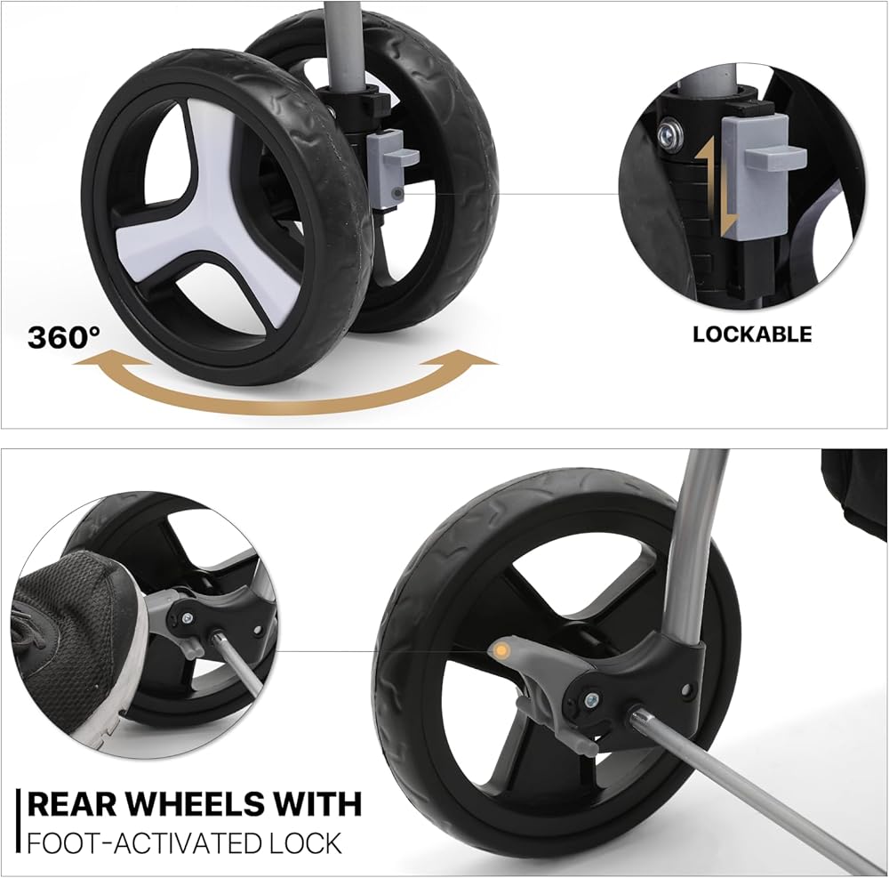 Superior Wheel Design for Smooth Rides: Navigate with ease thanks to our pet stroller's robust wheel system; It boasts a 5.5-inch front wheel diameter for agile maneuvering and a 6-inch rear wheel diameter for stability, complete with reliable rear wheel brakes for safe strolling