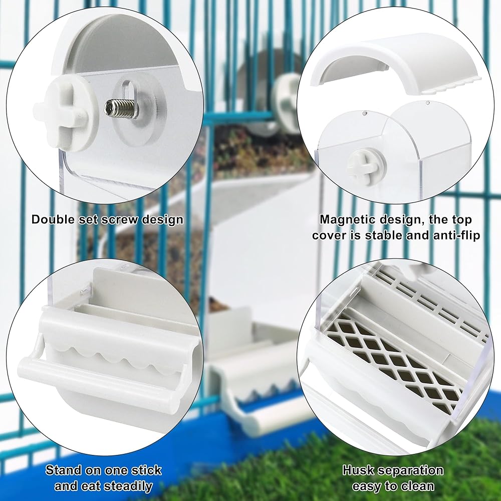 【Easy and Convenient Installation】 No complicated extra installation steps, you just need to fix it on the cage with the matching screws, you can give your love bird a perfect gift. The feeder can be fixed outside or inside the cage, and the top cover can be opened directly to add food without removing it.