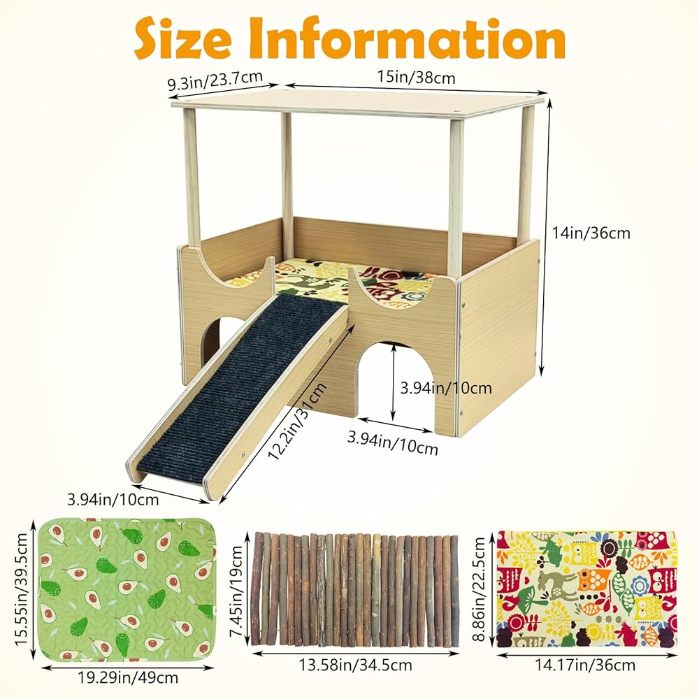 🐹 [Quality Material]: The guinea pig house is made of high quality wood, which is safe and durable with strong load bearing capacity. The mat and hammock are made of soft short plush fabric, both sides can be used, machine washable and reusable