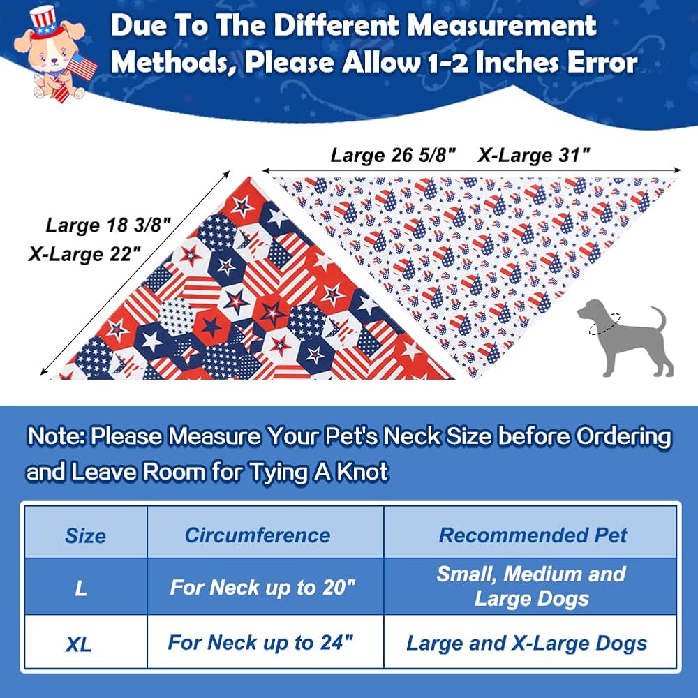 TWO SIZES TO FIT ALL DOGS - Available in large (fits up to 20inch neck), and extra-large (fits up to 24inch neck), almost all breeds of dogs can find a suitable size dog scarf. Please measure your pet's neck size and refer to the size chart, leaving room for tying, to ensure a perfect fit. If your pet's neck size is close to the maximum, consider ordering the next size up.