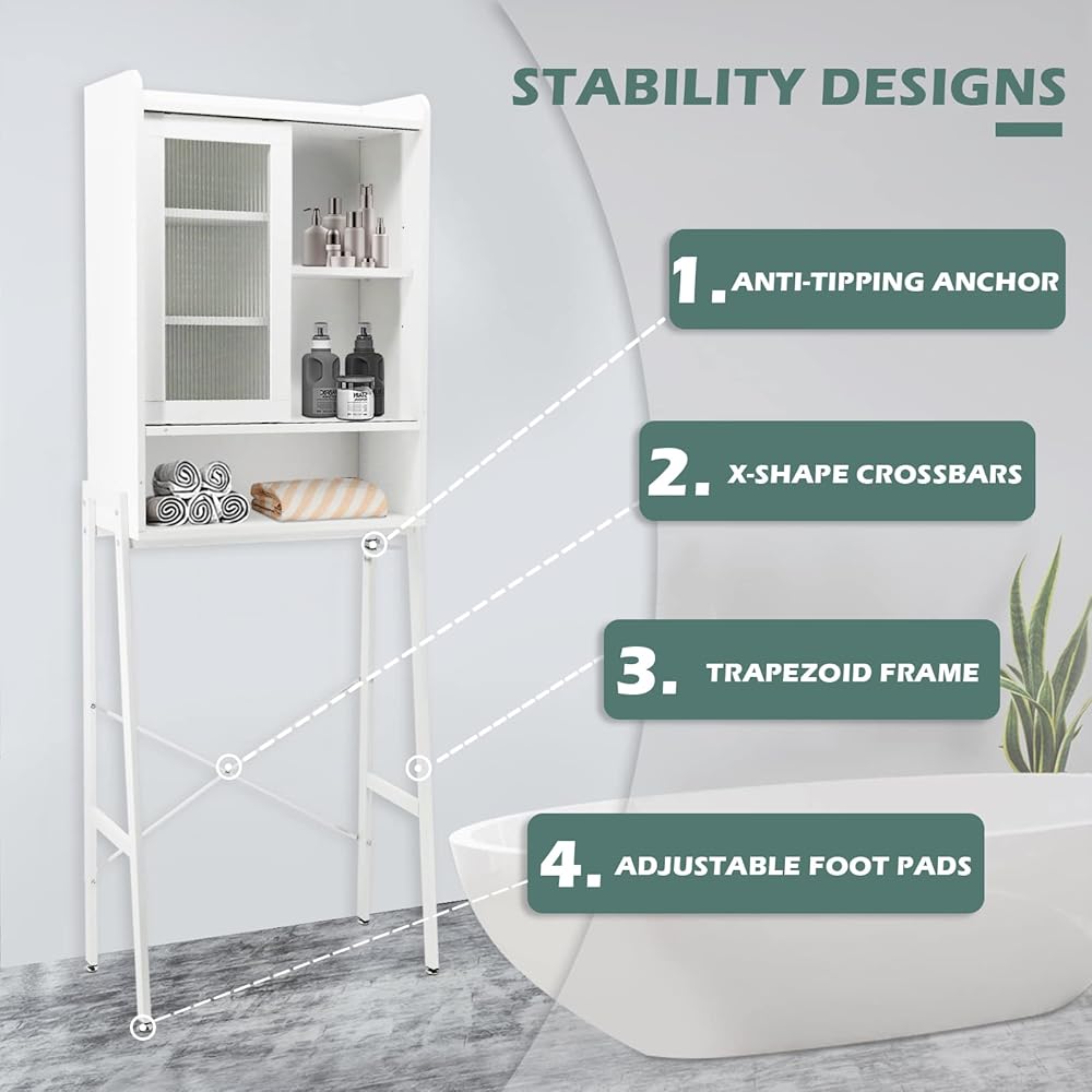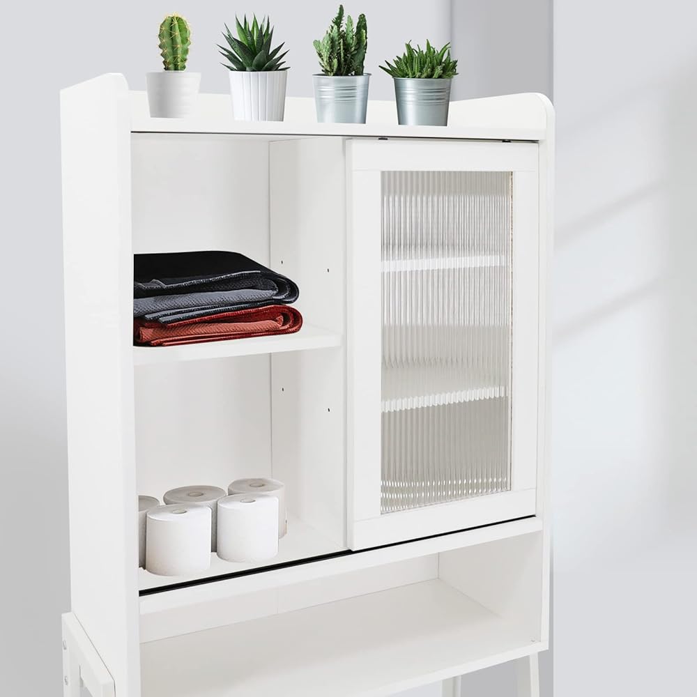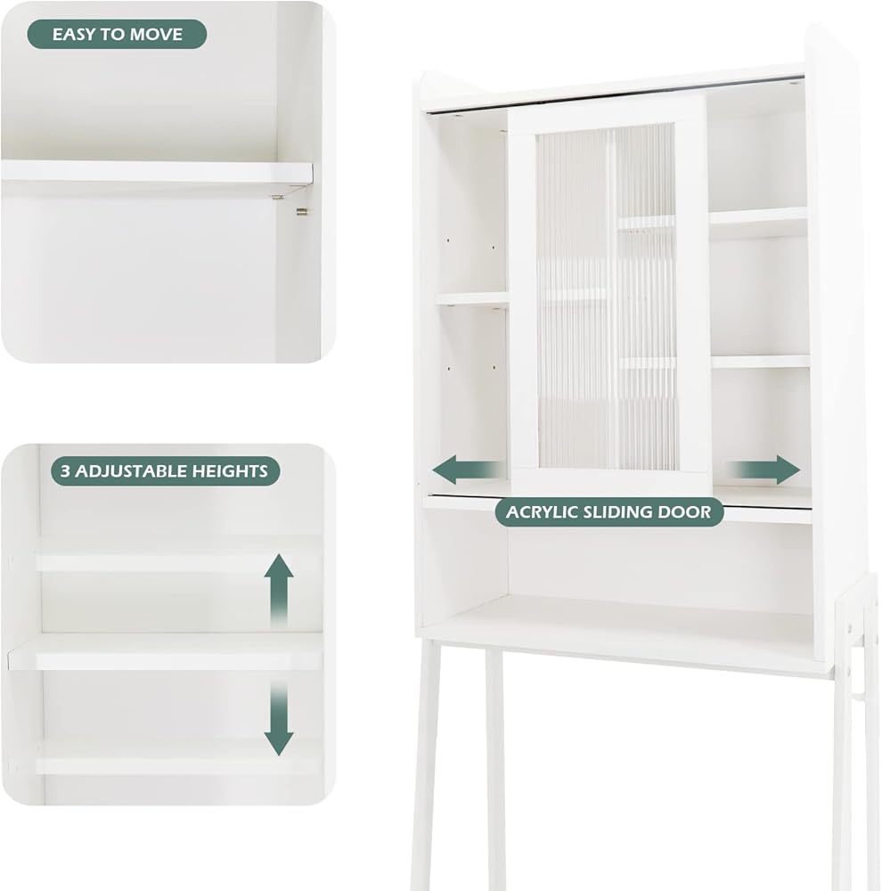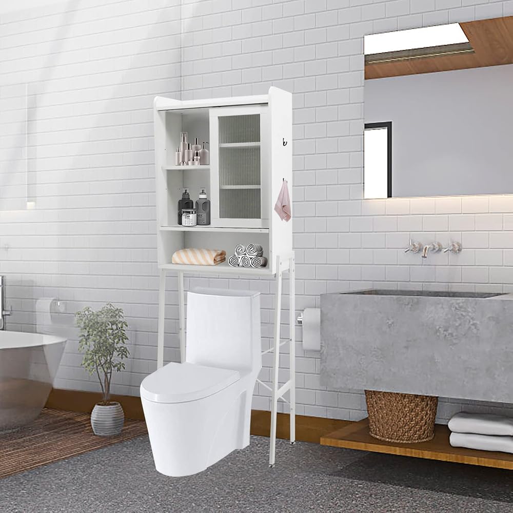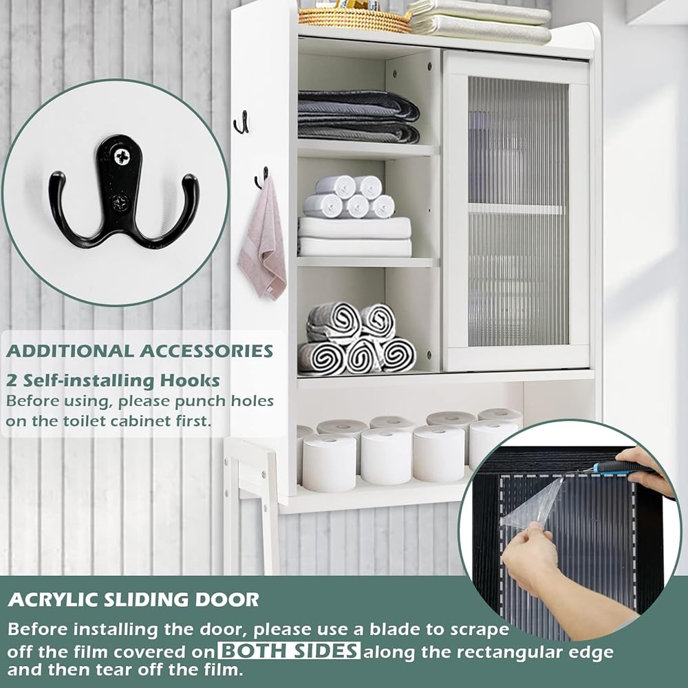 Over Toilet Storage Cabinet Organizer for Bathroom, Over Toilet Shelf, Freestanding Space Saver with Adjustable Shelves, Acrylic Sliding Door, Wide Open Shelf, 2 Hooks, Classic White