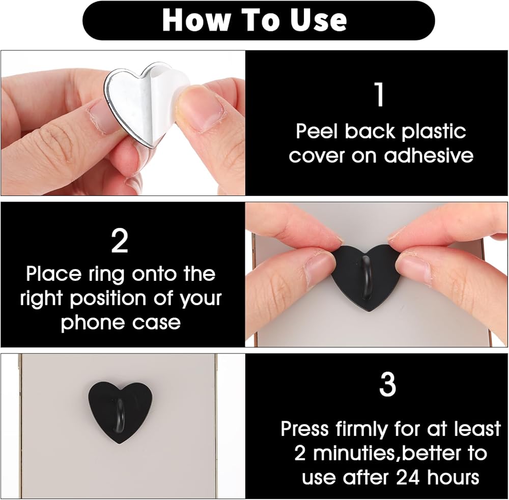 Peel And Stick: Just peel off the self-adhesive heart-shaped bottom sticker and gently stick the bracket on the metal surface of the hook, and you can easily get a cute mobile phone hook decoration, that is easy and quick to operate. But please note that after fixing the ring to the phone, please avoid pulling on it as the adhesive may not be fully set for the next 24 hours