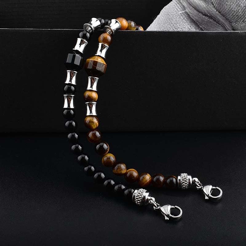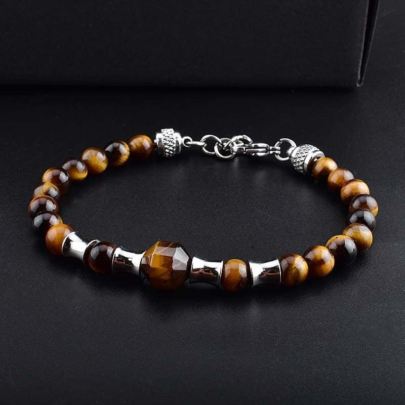 Handmade natural gemstone stress and anxiety power bead healing bracelet for men and women. This elegant bracelet is made from 6mm natural gemstone and stainless steel space beads finished with a strong lobster claw clasp with 3cm adjustable extender. Length: 19-22cm. Simple but stylish, it can go with any outfit ! It makes the perfect gift for yourself or a loved one. Available in different stone: Tiger's Eye, Black Onyx, Afican Pine . Ideal to ware alone or layer up with other bangle or bracelet for the urban look.