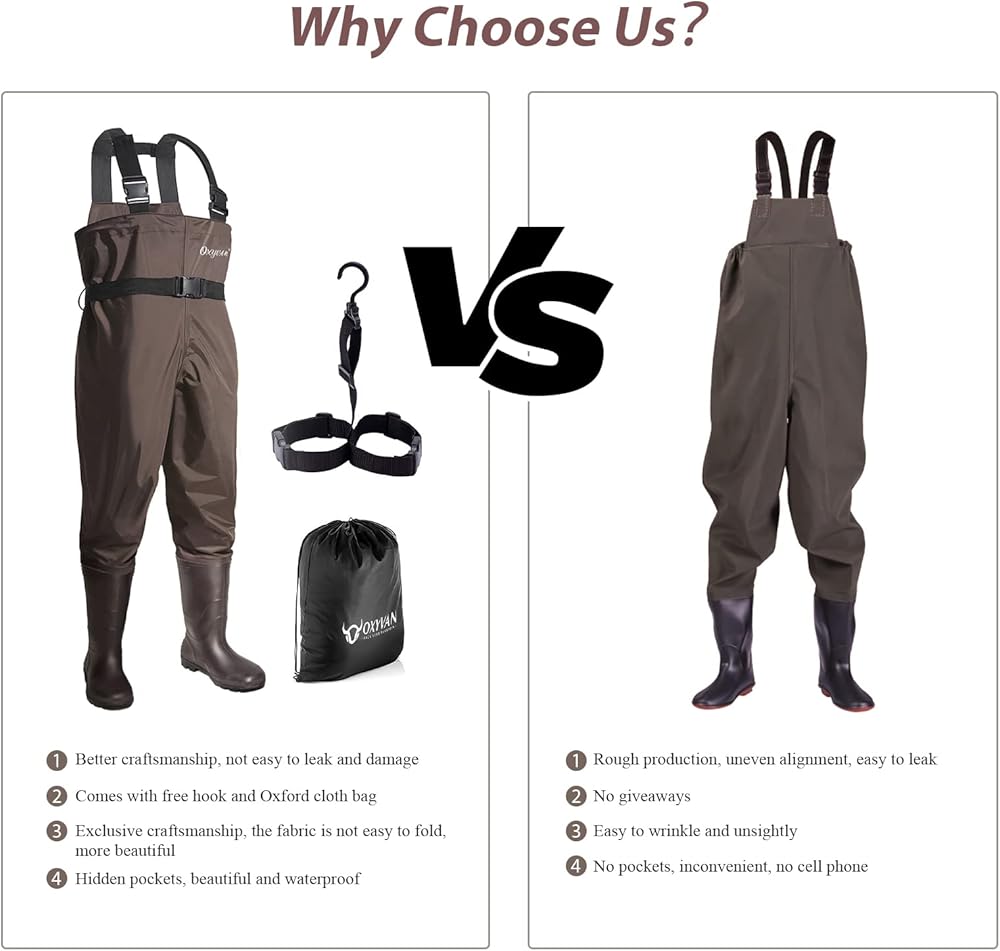 SAFE - Non-slip sole with thicken PVC keep you safe in the water, lighter material and adjustable belts help a lot with your balance control. Reinforced shoe vamp for added puncture protection. Rugged boots tread pattern of OXYVAN waders with boots provides you with better balance and traction on wet and muddy surfaces, better grip means fewer slips and falls.