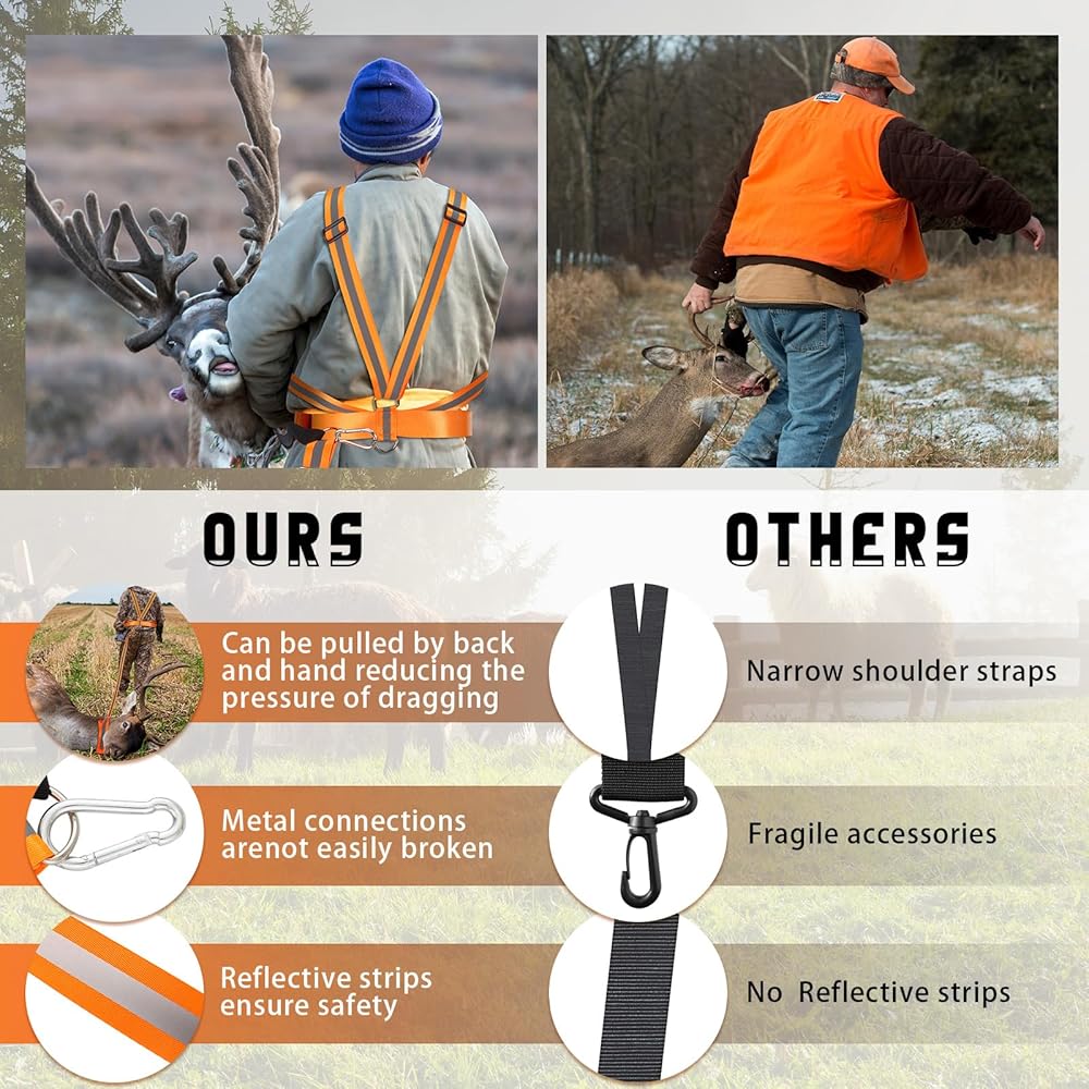 Big and Small Game: our deer haul and harness are designed for hunters, allowing you to haul game up to 400 pounds, while having reflective strips to ensure hunting safety at night, not only for the largest deer, but also for hauling timber, trees, elk, heavy hunting equipment, animal feed, turkeys, etc