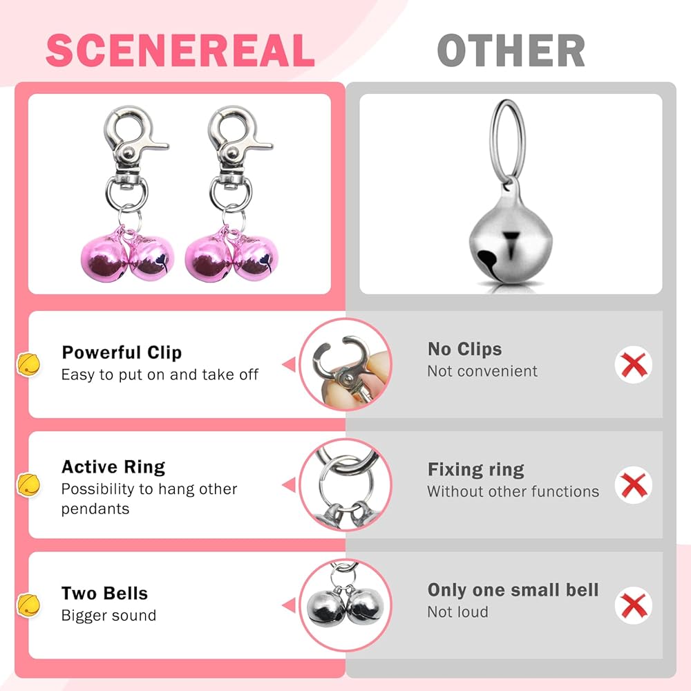SCENEREAL Bells for Dog Collars - 2 Pack Pet Hanging Ring Bell Accessories for Dog & Cat, Pet Pendant Collar Charm with Heavy Duty Snap Clips, Sliver Bells for Tracking and Training Christmas Gift, Pink+Pink