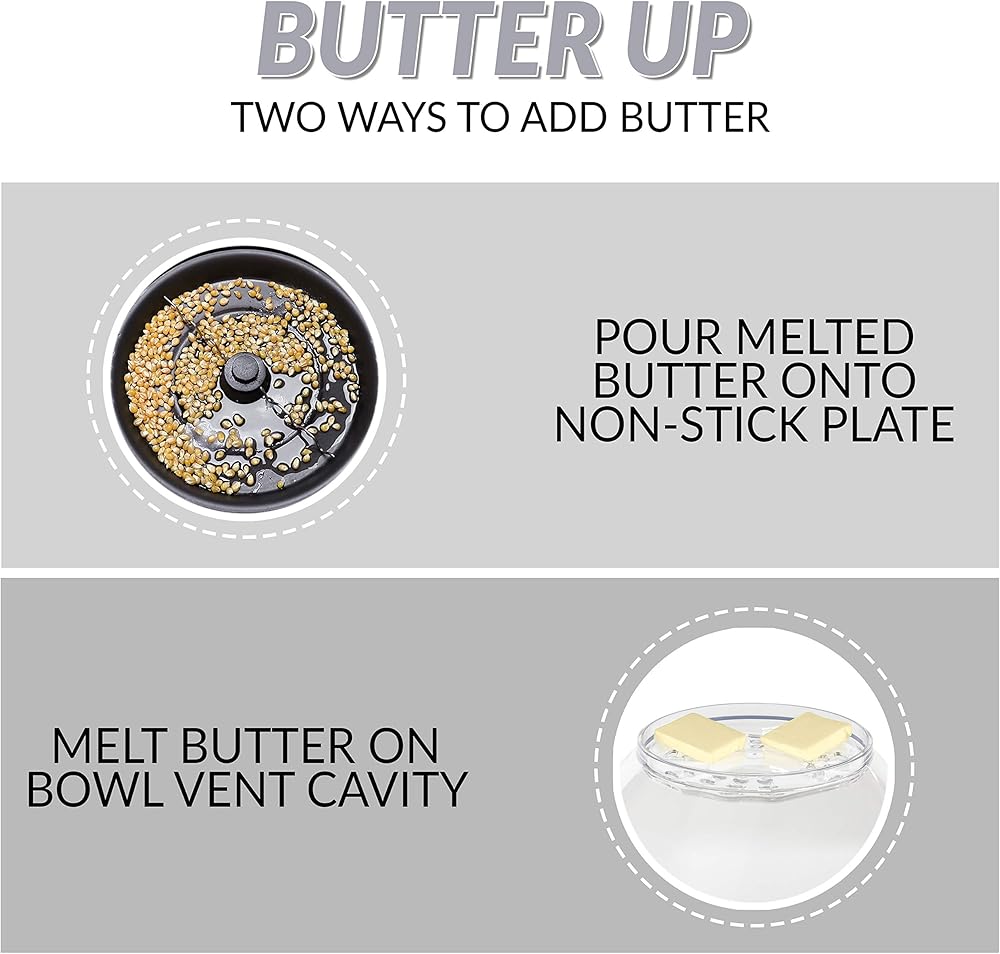 MULTIPUPOSE SERVING BOWL LID: In one flip, the popcorn dome lid transforms into a convenient serving bowl. Less dishes, more joy! While it's popping, the vents in the bowl allow moisture to escape and are great for melting butter.