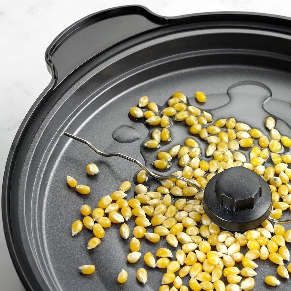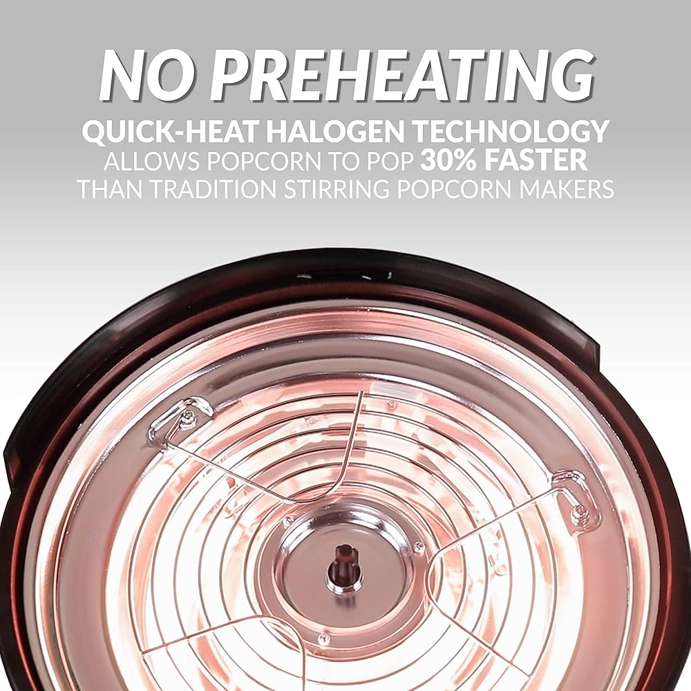 QUICK-HEAT TECHNOLOGY: Pops faster than traditional stirring popcorn poppers, no preheating needed! Your snack will be ready for you in a jiffy. The stirring rod evenly distributes kernels so that every kernel pops.