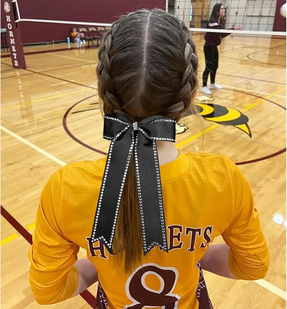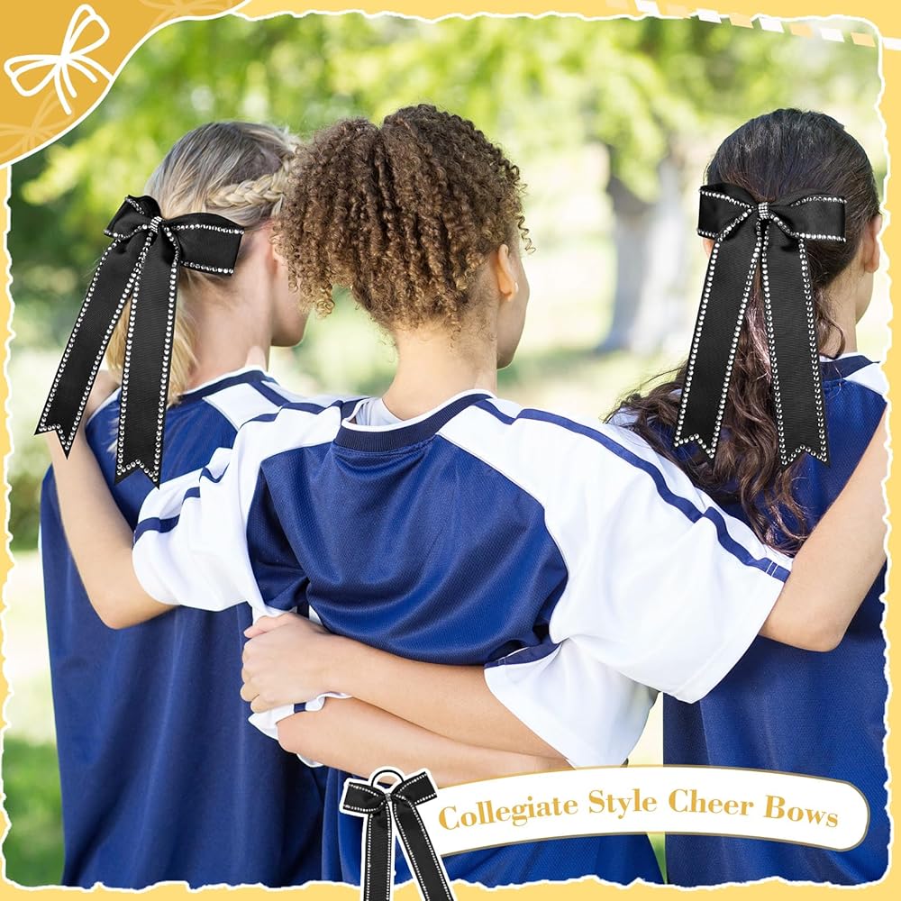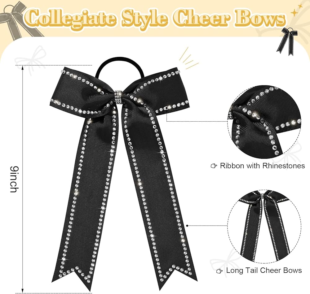 Collegiate Style Cheer Bows - Each bow is 5.5" x 9" in size and meticulously assembled using 1 1/2” grosgrain ribbon. Adorned with shimmering rhinestones, these bows exudes charm and sophistication. All our cheer bows are attached to high-quality hair elastics