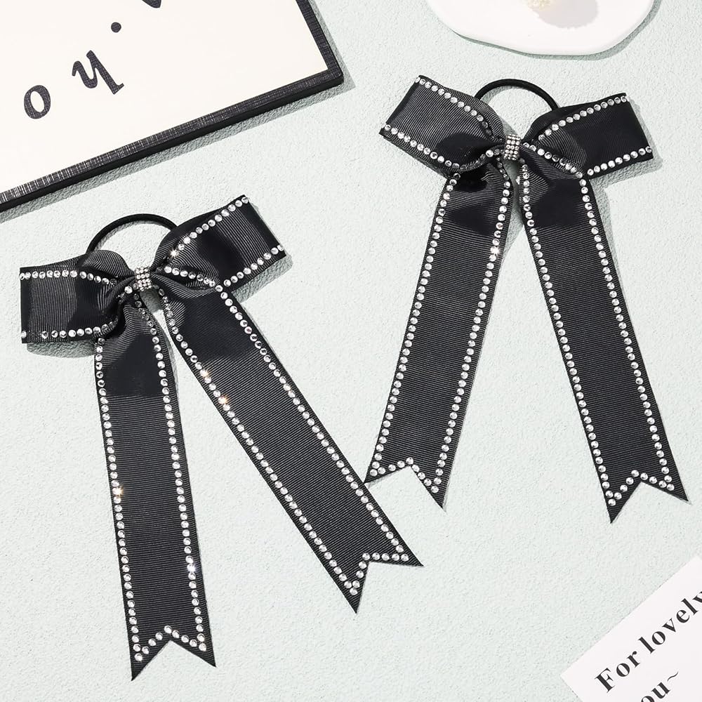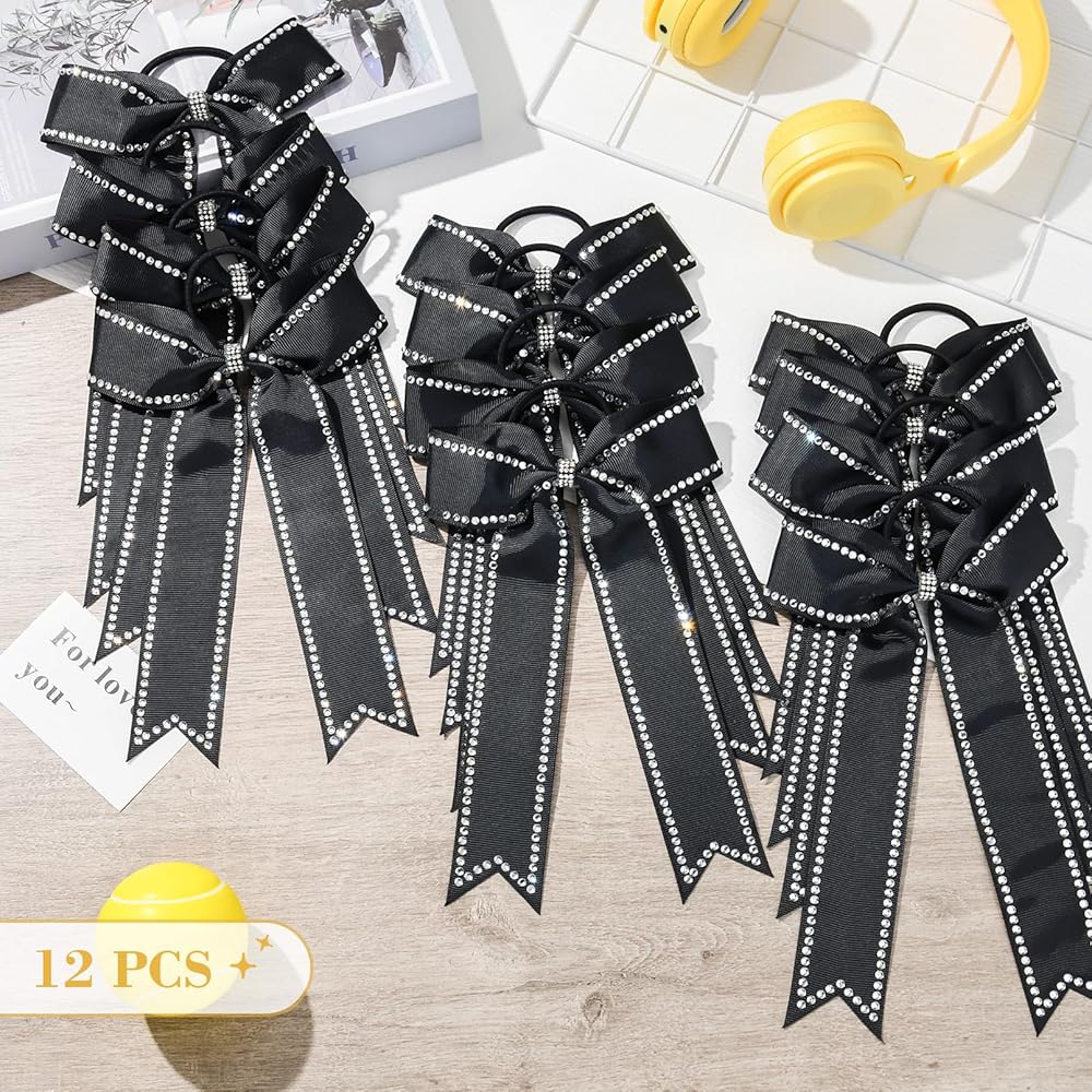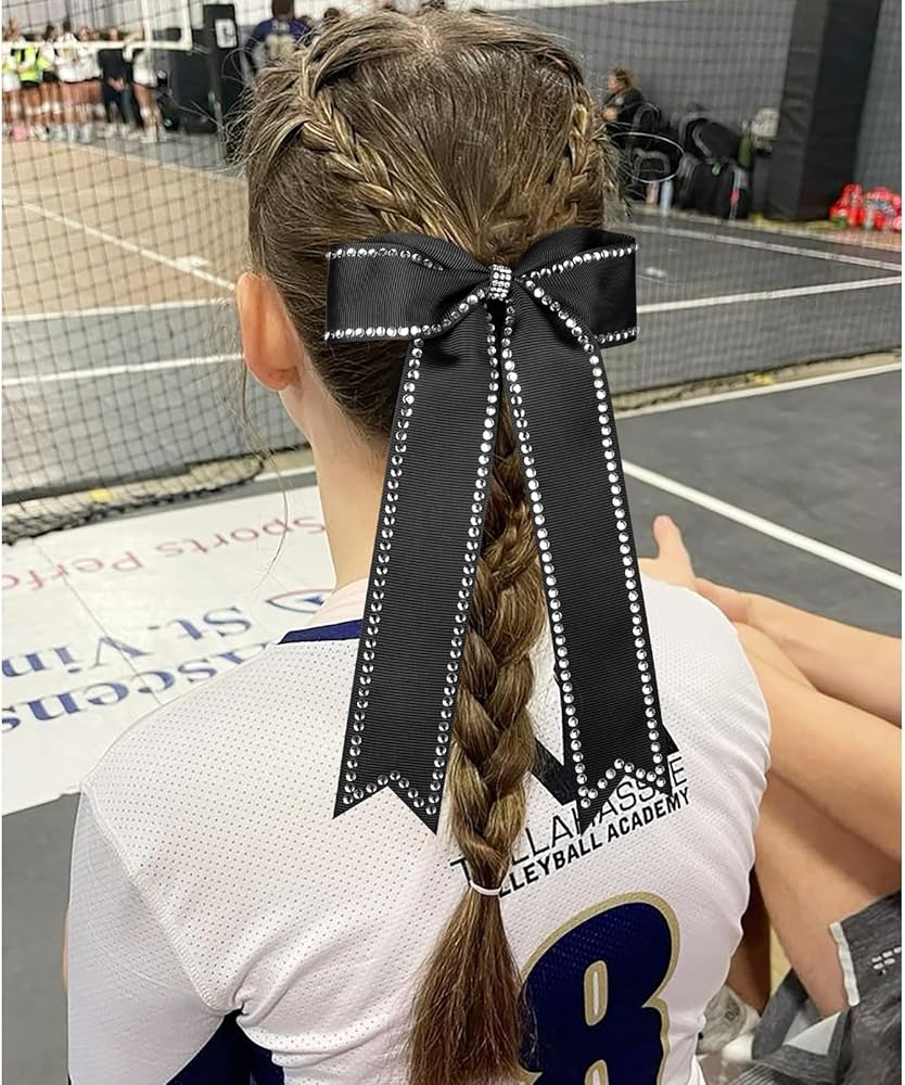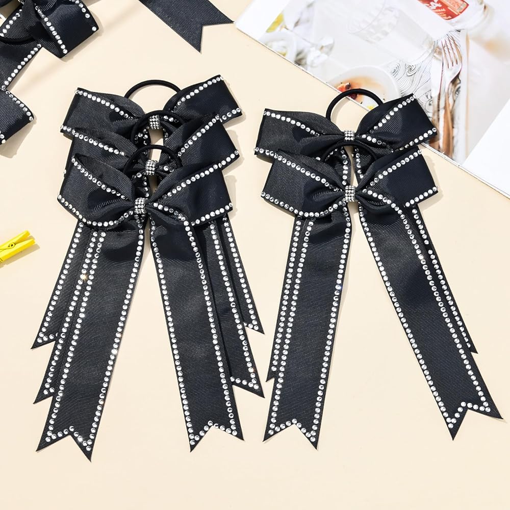 Collegiate Style Cheer Bows - Each bow is 5.5" x 9" in size and meticulously assembled using 1 1/2” grosgrain ribbon. Adorned with shimmering rhinestones, these bows exudes charm and sophistication. All our cheer bows are attached to high-quality hair elastics