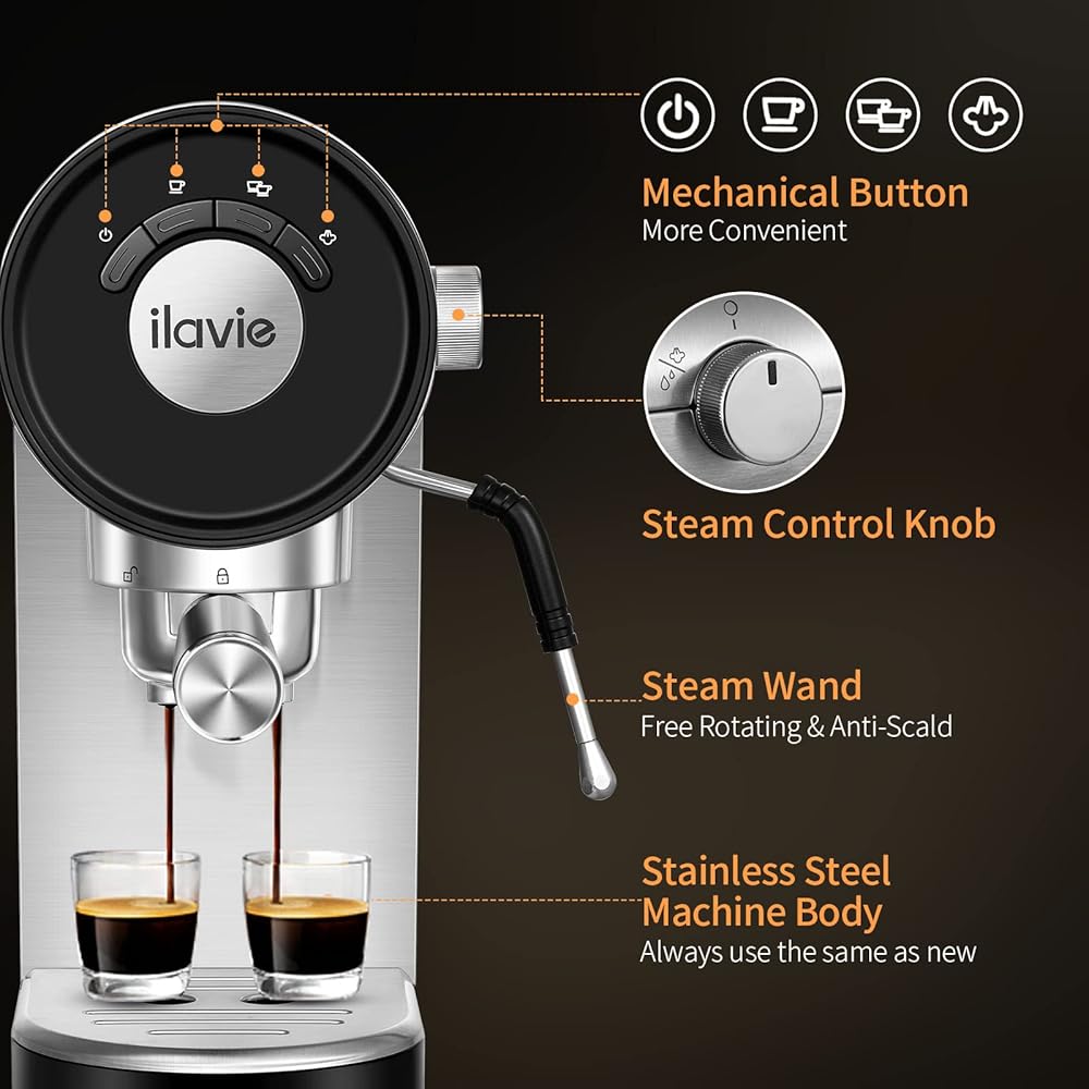 Compact and Stylish Design: This espresso coffee machine is great for any kitchen, which is boasts a sleek, compact design that doesn't sacrifice style or functionality. It is stainless steel construction adds a touch of modern elegance to your countertop while being durable and easy to clean.