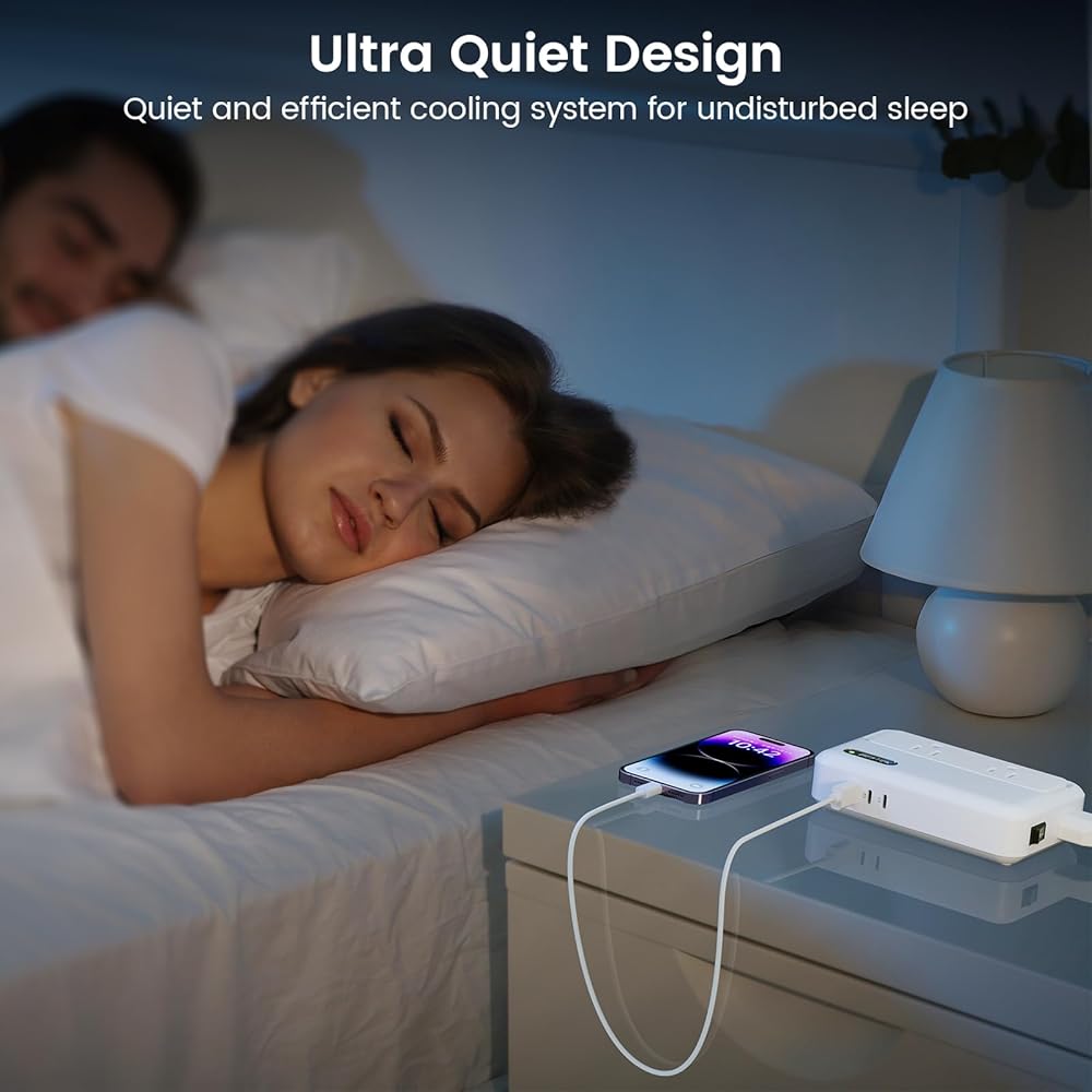 【PD35W+QC18W Fast Charging】Equipped with 2 PD35W ports, 1 QC18W port, and 2 AC outlets, allowing simultaneous charging for up to 5 different devices. The USB port provides up to 36W maximum output for fast charging of phones, watches, iPads, laptops and more. Compared with other traditional chargers, the charging speed is increased by more than 50%. Easily charge your devices on the go, making travel easier.