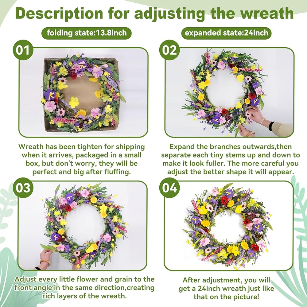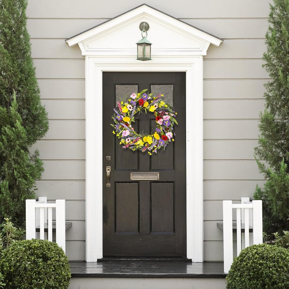 ❀Material:bainianMS spring wreaths for front door is made of EVA、paper and silk cloth. Handmade by workers. The iron wire of the pole is covered with crepe paper, which can be bent and shaped arbitrarily.The base is a durable iron ring full of daisy, lavender,and all kinds of beautiful wild flowers in various colors.The entirely realistic wreath has bright color and vibrant looking.