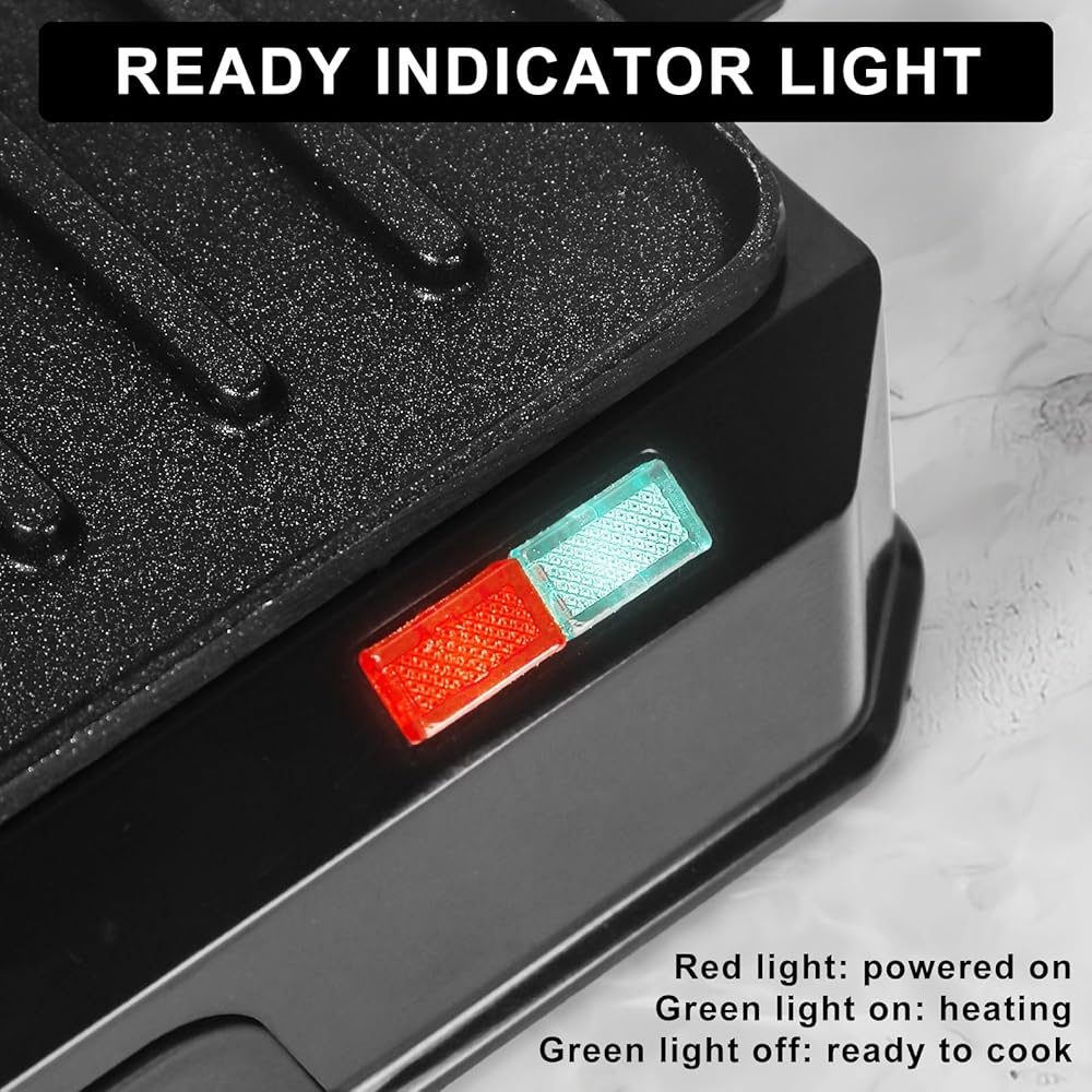 Bake to Perfection: The red and green indicator lights for On, Ready and Done, respectively. Follow the indicator lights: the red light means the machine is energized, the green light means the waffle maker is heating up, the green light is off means it's ready to bake, and when the temperature drops, the green light will come on again, and the plates will automatically continue to heat up