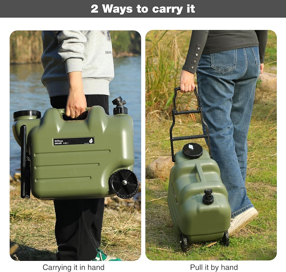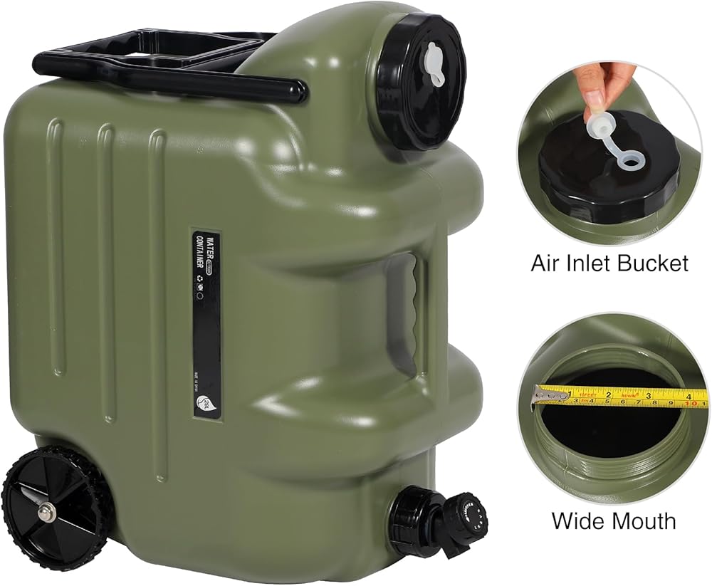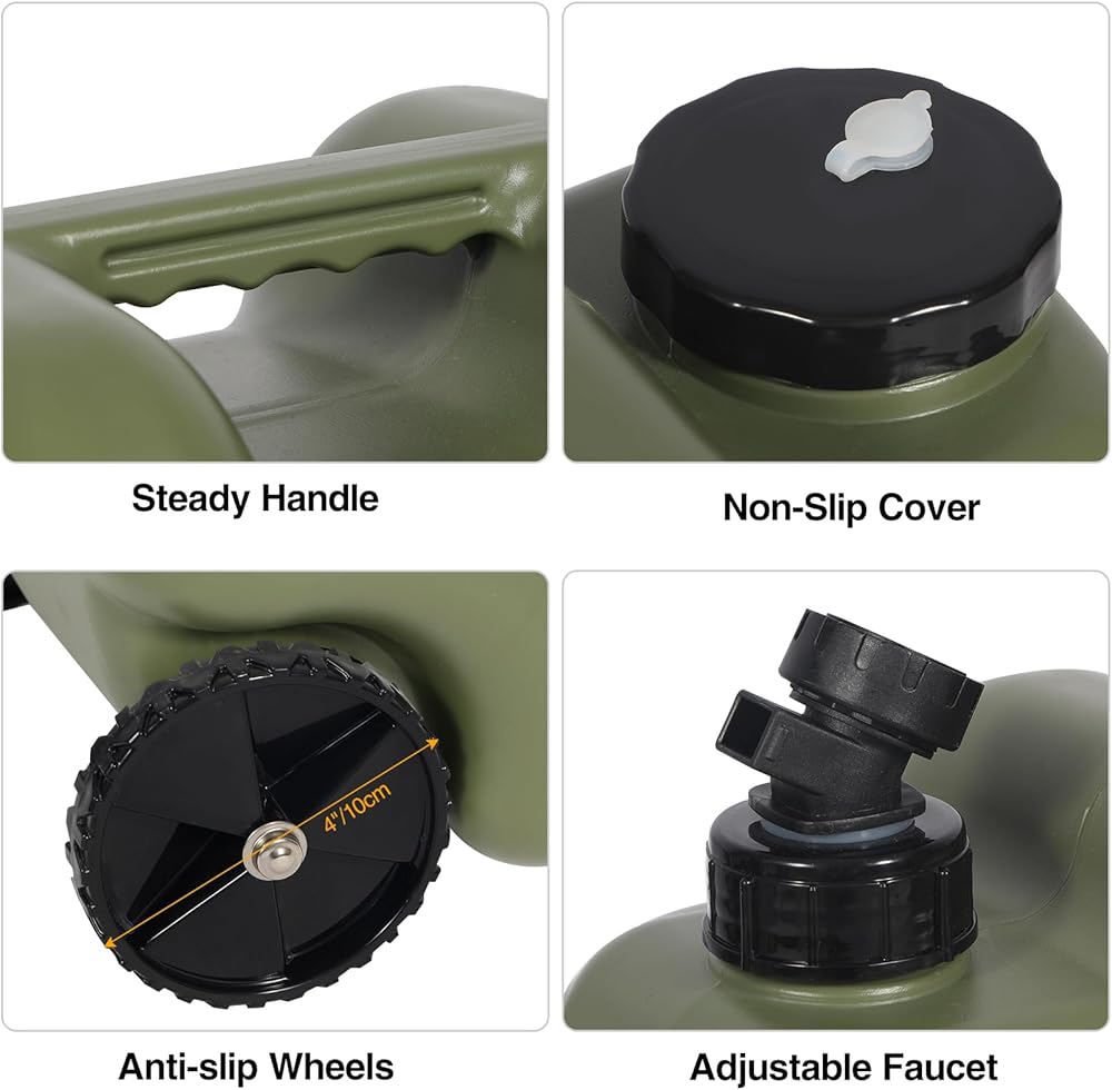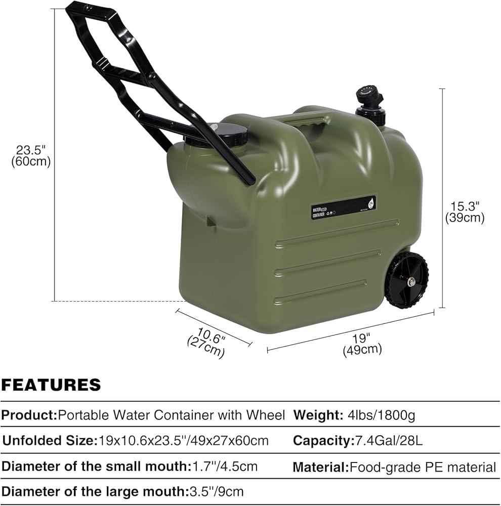 REDCAMP 7.4 Gal Water Container with Wheels & Spigot | Portable Rolling Emergency Camping Water Jug with Folding Handle | BPA Free Food Grade Water Storage Tank for Camping, Hiking(28L, Green)