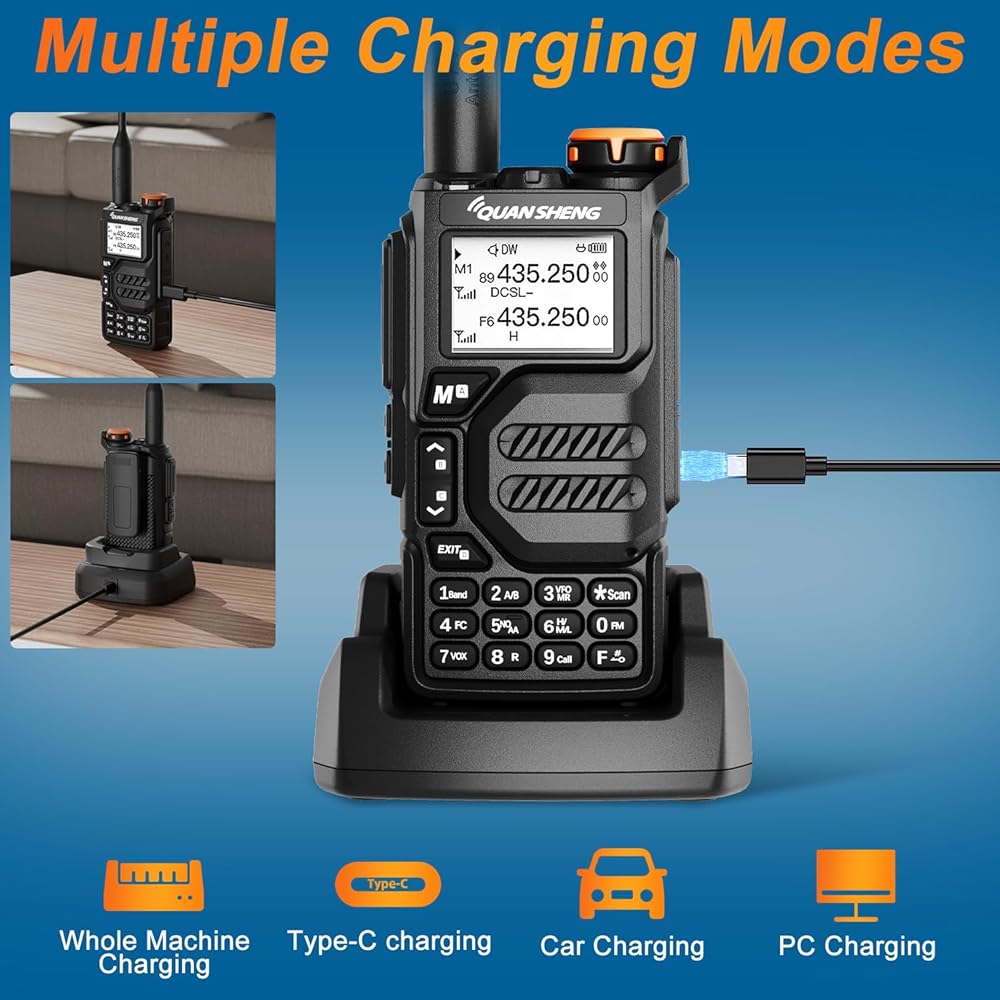 [Support two charging methods]: Radio walkie talkie with base charging and USB charging cable, you can charge on any device with a USB slot at any time, or you can quickly charge it through a desktop charger. Whether at home, in the office or outdoors, it can be charged conveniently to meet your different scene needs.