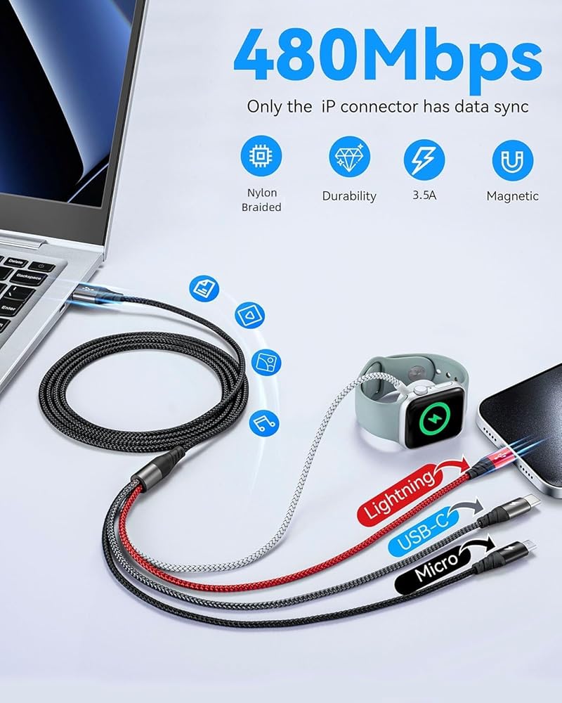 ⌚【4 in 1 Watch & Phone Charger】The Multi Charging Cable is designed to offer four different ports: USB C/Micro/Lighting/iWatch Charger.There's no need to prepare and carry multi charger cords leads everywhere.Support to charge four devices at the same time,is suitable as a backup charger for traveling.