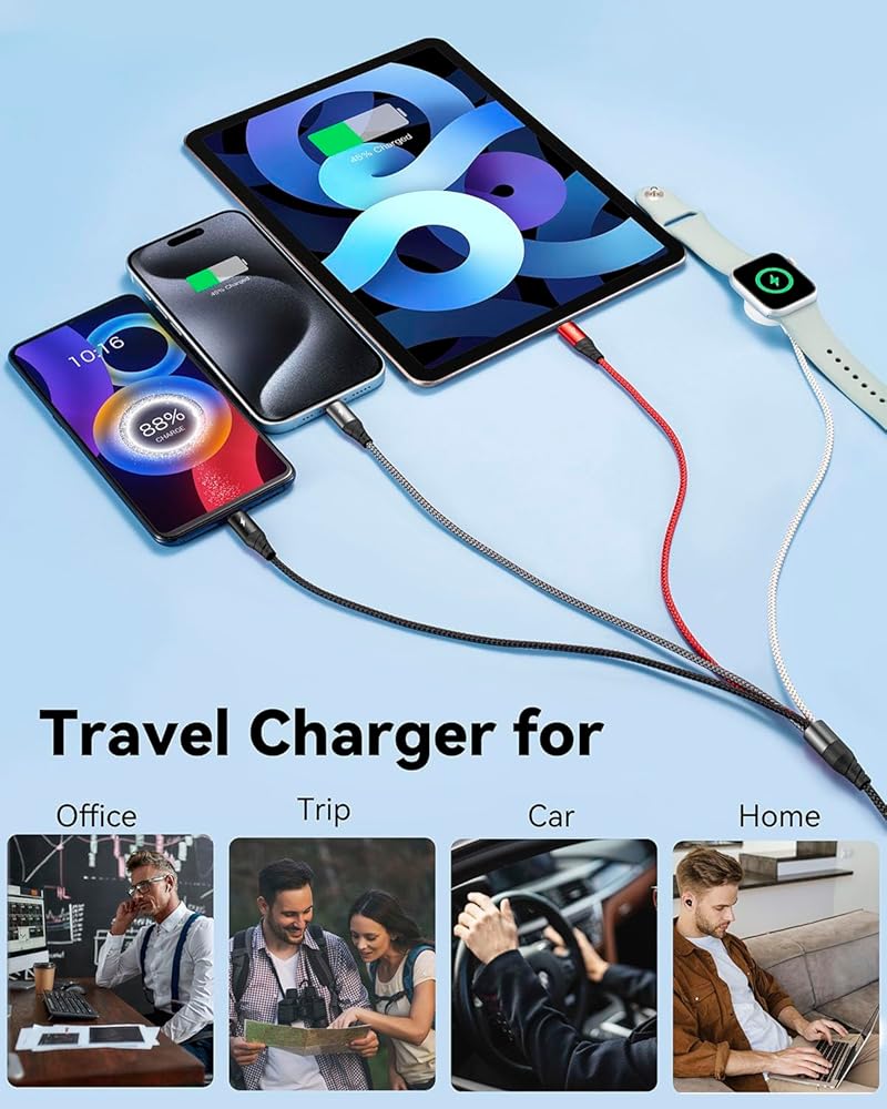 4 in 1 Multi Charging Cable for Apple Watch Charger/iPhone Charger,Travel Essentials Multi Charger Cord for Multiple Devices Compatible with iWatch UItra/SE/Series 9-1/iPhone 17 16 15 14/Galaxy