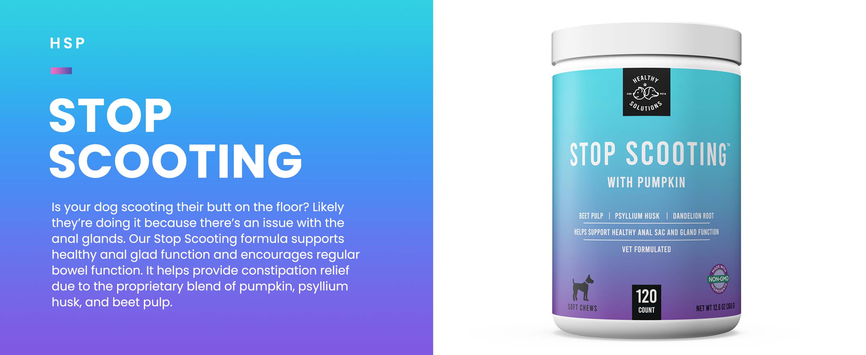 PREMIUM FIBER FOR DOGS - NO SCOOT -- Supports healthy anal gland function and encourages regular bowel function. Helps provide constipation relief due to the proprietary blend of pumpkin, psyllium husk, and beet pulp.