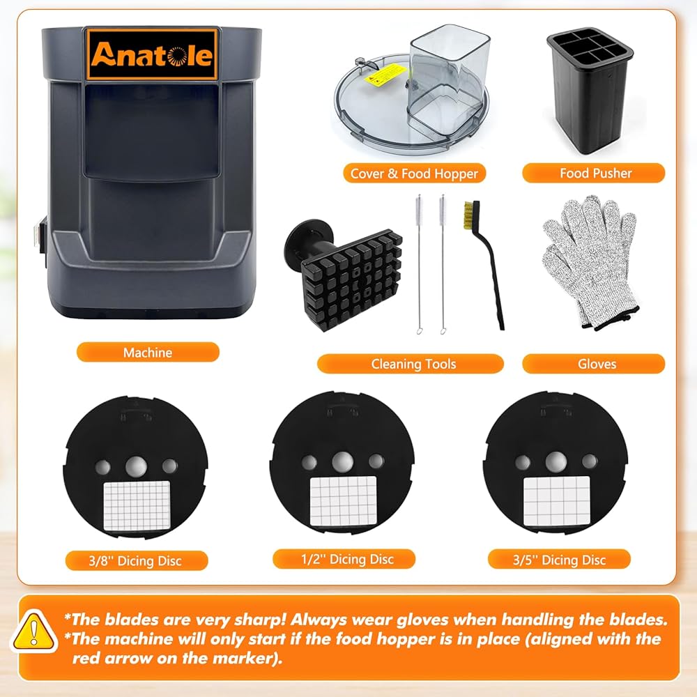 Great Time Saver: The powerful vegetable dicer has an enlarged feed opening, one-touch switch, and strong heat dissipation, making it efficient; takes only about 10 seconds to cut a potato; can be used continuously for 20-30 min, saving time