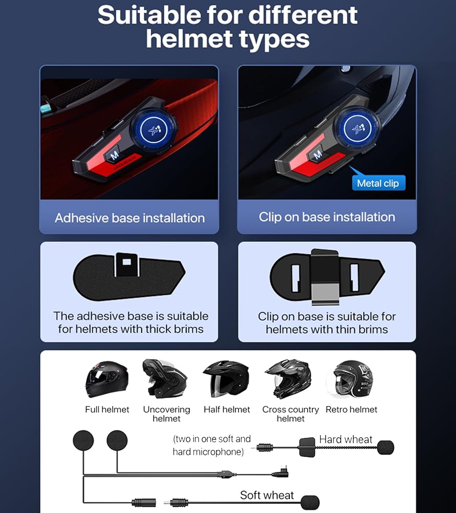 7: The product is equipped with a soft and hard 2-in-1 microphone, Velcro base and snap base two kinds of installation methods, suitable for full helmet, uncovered helmet, pull helmet, half helmet, retro helmet and other helmet type installation.