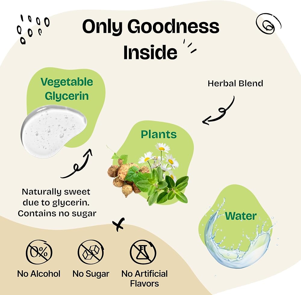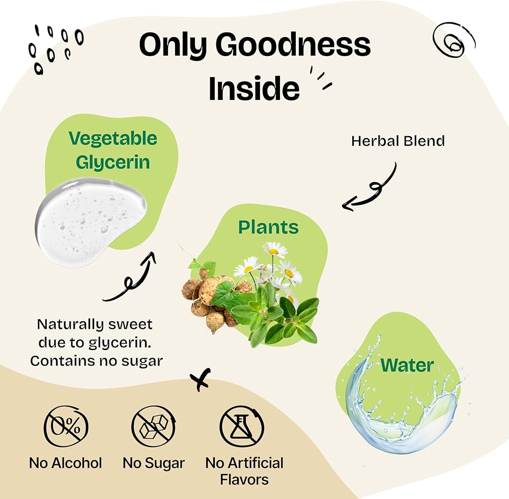 Clean Formula: Our herbal blend, purified water, and glycerin create a pure formula, free from sugar, alcohol, preservatives, artificial colors, or animal-derived ingredients.