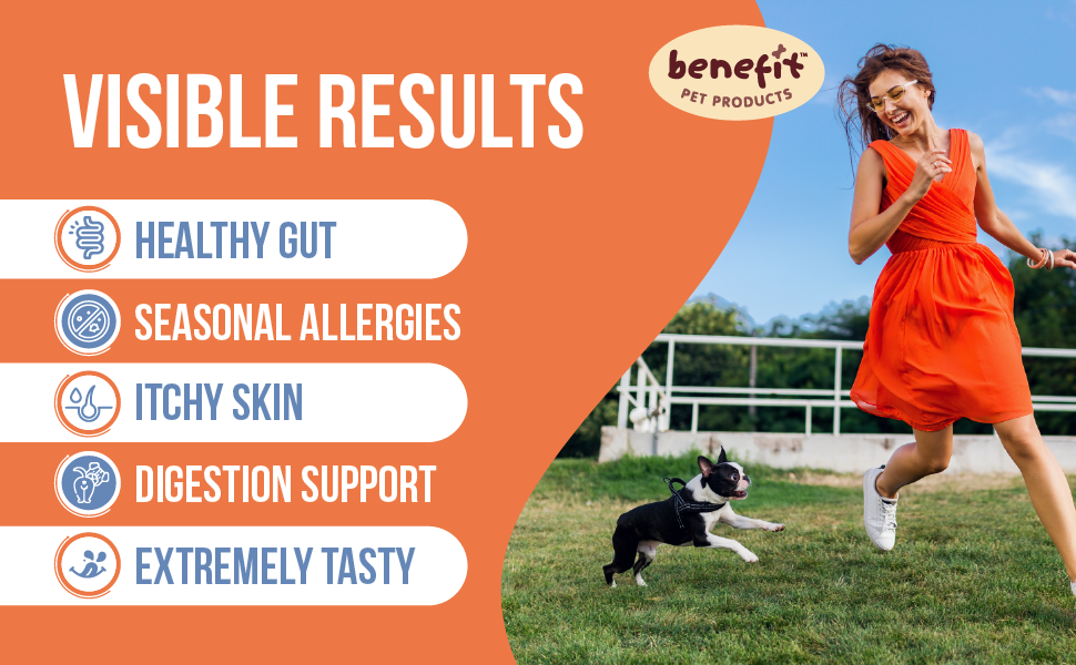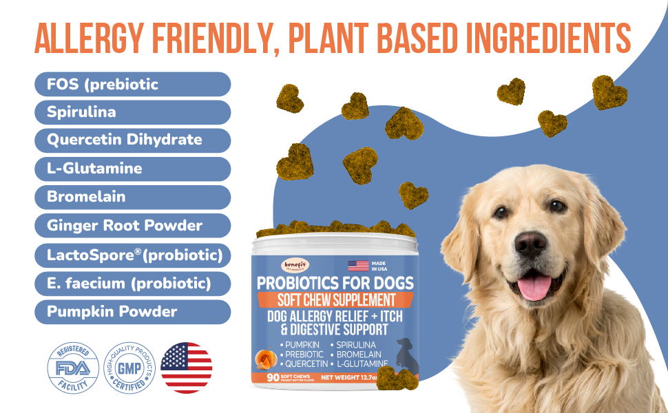 CAN IMPROVE DOG ALLERGIES, Say goodbye to itchy skin, these dog allergy chews can combat all dog allergies including inflammation. Packed with dog probiotics for yeast, itchy skin, itchy ears, shedding hair, and hot spots. Conventional pet foods often contribute to itchy skin troubles. With Benefit Pet, say goodbye to mystery meats and fillers, and hello to digestive superfoods like ginger and pumpkin for dogs, and quercetin for dog allergies.
