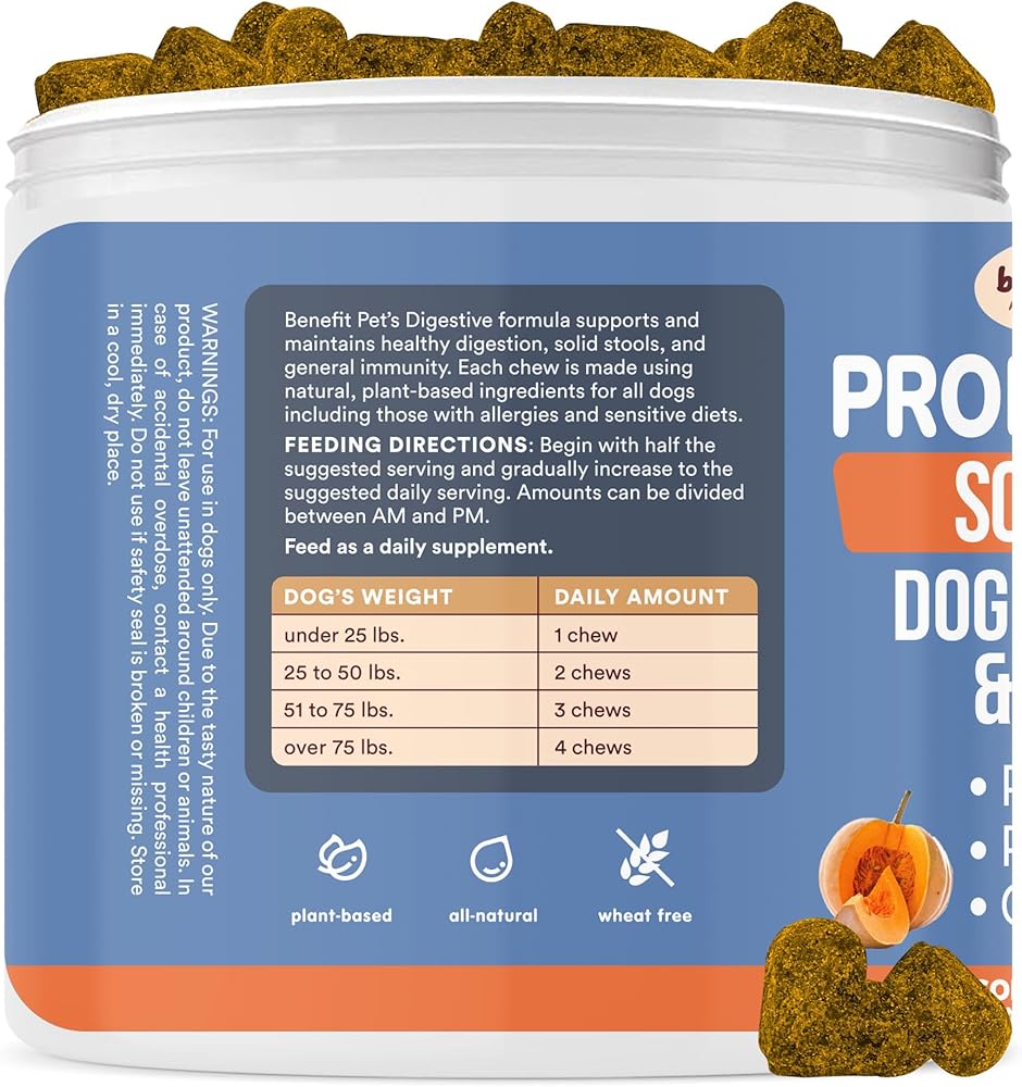 DIGESTION SUPPORT, Our chews are made to reduce diarrhea, to help give your dog the perfect poop. After 2 years of development, we took our original pumpkin dog treats and added effective probiotics for dogs digestive health. This fiber supplement is enriched with pumpkin for dogs and fiber to ensure your dog receives comprehensive support for gut health.