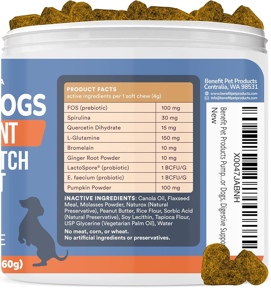 PROBIOTIC CHEWS FOR DOGS, Our soft chews are enriched with fiber and digestive enzymes with probiotics and prebiotics for dogs. Each soft chew also includes pumpkin powder for dogs, plus ginger, Spirulina, Quercetin with Bromelain for dogs. These unique dog probiotic chews provide essential nutrients without artificial additives, catering to your pet's nutritional needs and dog allergy support by being grain free, wheat free, and gluten free.