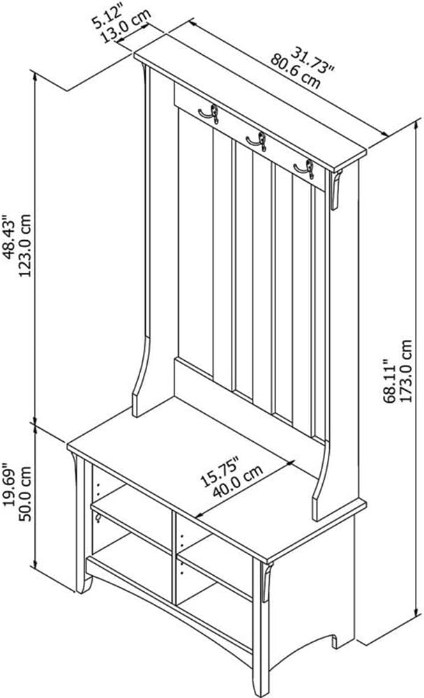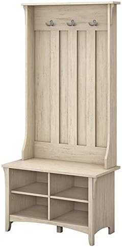 Let the Bush Furniture Salinas Hall Tree with Storage Bench welcome you home. Have a seat on top of the spacious Bench while you put on or take off your shoes. Four cubby shelves organize your entryway so you're not tripping over footwear when you walk in the door. Set your bags down on top of the Shoe Bench while you hang up your coat and get comfortable. The Hall Tree has three Tumbled Pewter double prong hooks to hold your family's jackets, scarves, hats and more. Available in your choice of attractive Antique White, Cape Cod Gray and Vintage Black finishes, the country feel of the Hall Tree with Storage Bench looks great even beyond your entryway. Two adjustable shelves hold various items in any space, including a bedroom, dorm room or hallway. Tapered legs, a curved base and decorative wood detailing with eye-catching vertical accents inspired by timeless Mission styling complement the casual homes of today. The entryway organizer is tested to meet ANSI/SOHO quality standards for safety and performance and is backed by the Bush Furniture 1 Year Manufacturer's Warranty. Complete your space with coordinating items from the Salinas Collection.