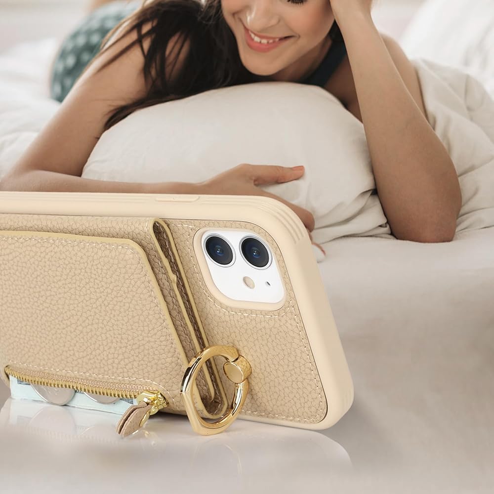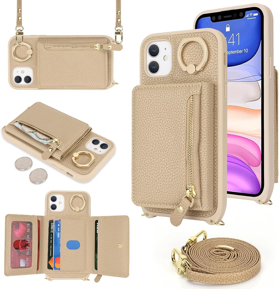 for iPhone 11 Case with Card Holder,for iPhone 11 Wallet Case for Women with Strap Crossbody Lanyard Stand Ring,PU Leather Zipper Pocket Phone Cover-Beige