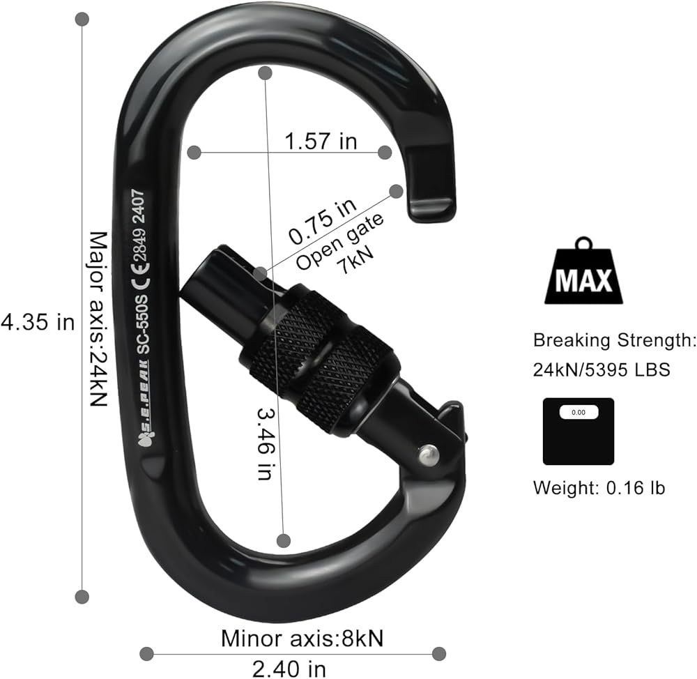 CE Safety Guarantee: CE 1019 Certified, identical to EN12275:2013, EN362:2005,EN365:2005 standards. Lightweight yet sturdy, oval carabeaner is rigorously tested to withstand heavy loads up to 24 kN and feature a sturdy locking mechanism to ensure 100% safety. Grab a pack of these essential climbing carabeaners and experience the freedom to fully embrace the outdoors.