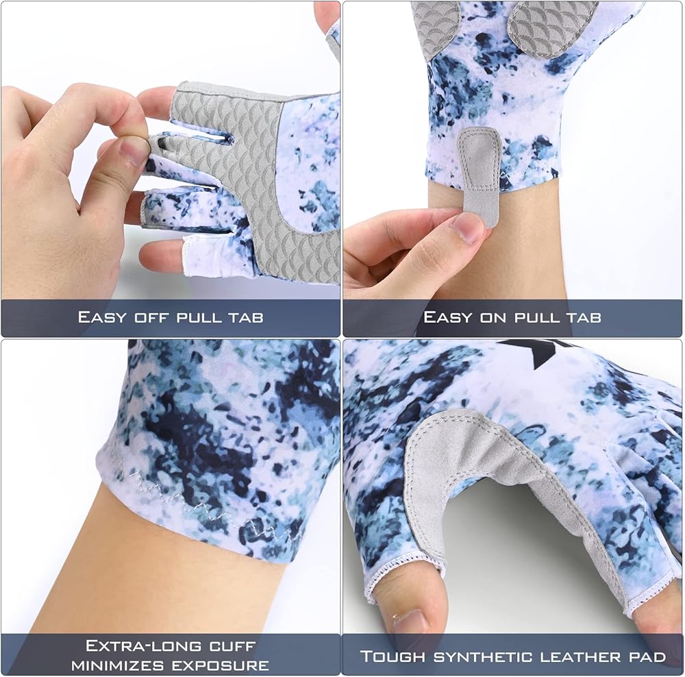 *Microfiber Palm & Pull Tabs– Microfiber palm with non-slip polymer and tough synthetic leather pad re-enforced primary wear points and help to extend the life of your fishing gloves and offers extra padding. Integrated pull tabs on the cuff and middle finger make it easy to pull on or take off your sun gloves.
