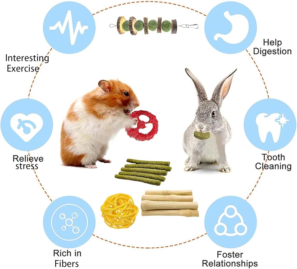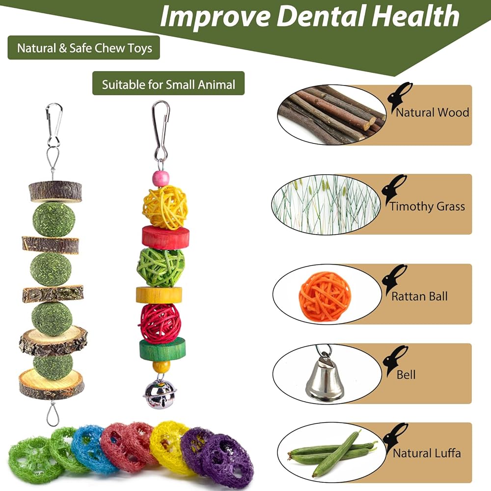 【WIDE USES 】These bunny chew toys can be hang in the cages with hooks,fit for rabbits,bunny, hamsters, guinea pigs, squirrel, rabbits,chinchillas, parrot,, providing more fun for your pets.