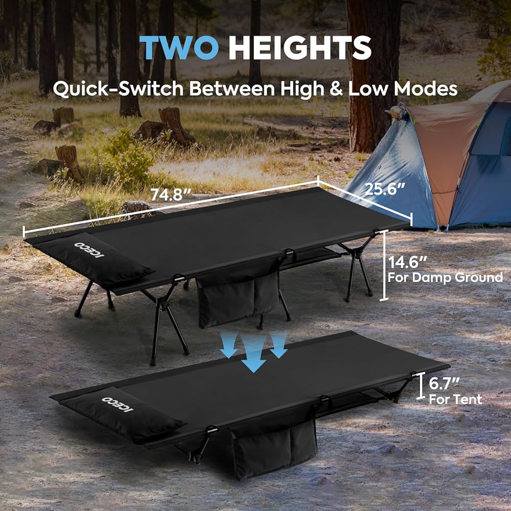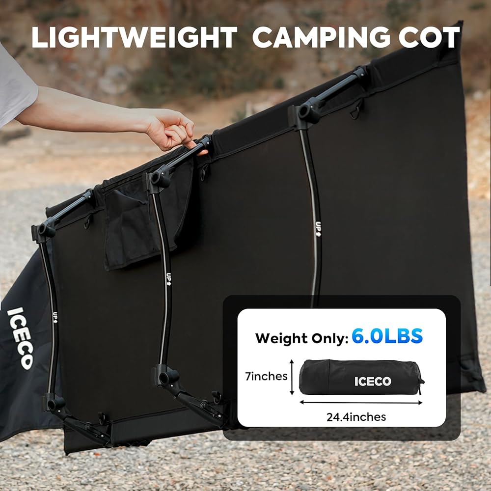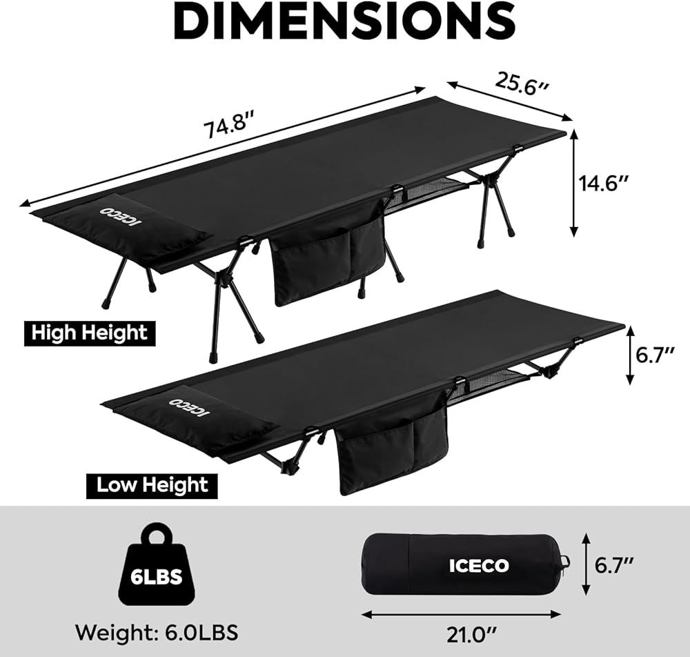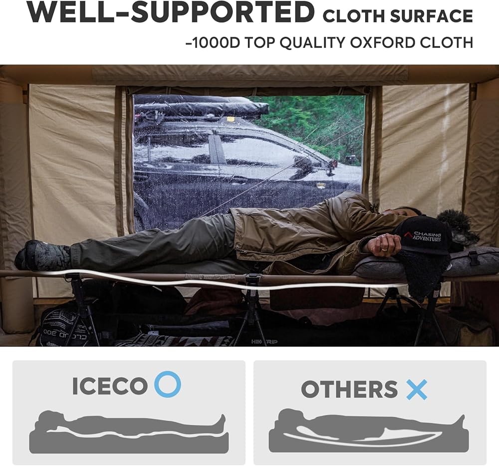 Premium Fabric Material: ICECO camping beds are made from tear-resistant 1000D Oxford fabric+300D Elastic Silk Grid Fabric. With excellent wear resistance, easy cleaning and breathability, waterproof and moisture-proof, more comfortable and durable than other camping beds.